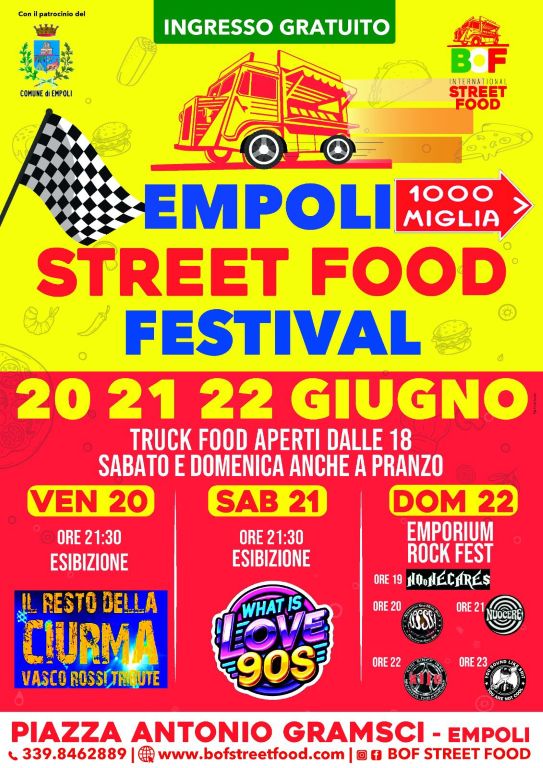 Si aggiunge anche il BOF International Street Food Festival in Piazza Antonio Gramsci ad Empoli, dal 20 al 22 giugno, per salutare il passaggio della prestigiosa 1000 Miglia e impreziosire con gusto e sapori il programma di Empoli Classic Passione & Motori. Tre giorni di festa, con ingresso gratuito e il patrocinio del municipio locale, per abbinare alla buona gastronomia in formato truck food della grande tradizione culinaria italiana ed estera una serie di iniziative di intrattenimento per il divertimento di grandi e piccini. Una formula vincente che ha fatto breccia da tempo tra il pubblico. Dalle specialità siciliane e romane ai mitici arrosticini abruzzesi. Ma anche pulled pork, pesce fritto, hamburger di ogni tipo, paella, wrapn e l’angolo della dolcezza con crepes e churritos.