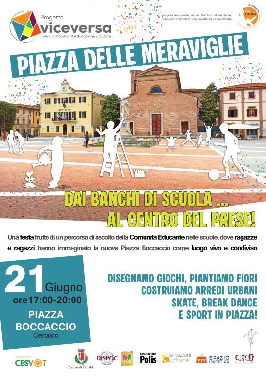 Il Progetto Viceversa è realizzato da Associazione Polis Certaldo, Narrazioni Urbane, Comune di Certaldo, Università di Siena - DISPOC Dipartimento di Scienze Sociali Politiche e Cognitive, Associazione Spazio Ipotetico, Associazione Circo Libero Tutti e Istituto Comprensivo di Certaldo, con il patrocinio di Cesvot. Il progetto è stato selezionato da “Con i Bambini” nell’ambito del Fondo per il contrasto della povertà educativa minorile. Il Fondo nasce da un’intesa tra le Fondazioni di origine bancaria rappresentate da Acri, il Forum Nazionale del Terzo Settore e il Governo. Sostiene interventi finalizzati a rimuovere gli ostacoli di natura economica, sociale e culturale che impediscono la piena fruizione dei processi educativi da parte dei minori. Per attuare i programmi del Fondo, a giugno 2016 è nata l’impresa sociale Con i Bambini, organizzazione senza scopo di lucro interamente partecipata dalla Fondazione CON IL SUD. www.conibambini.org