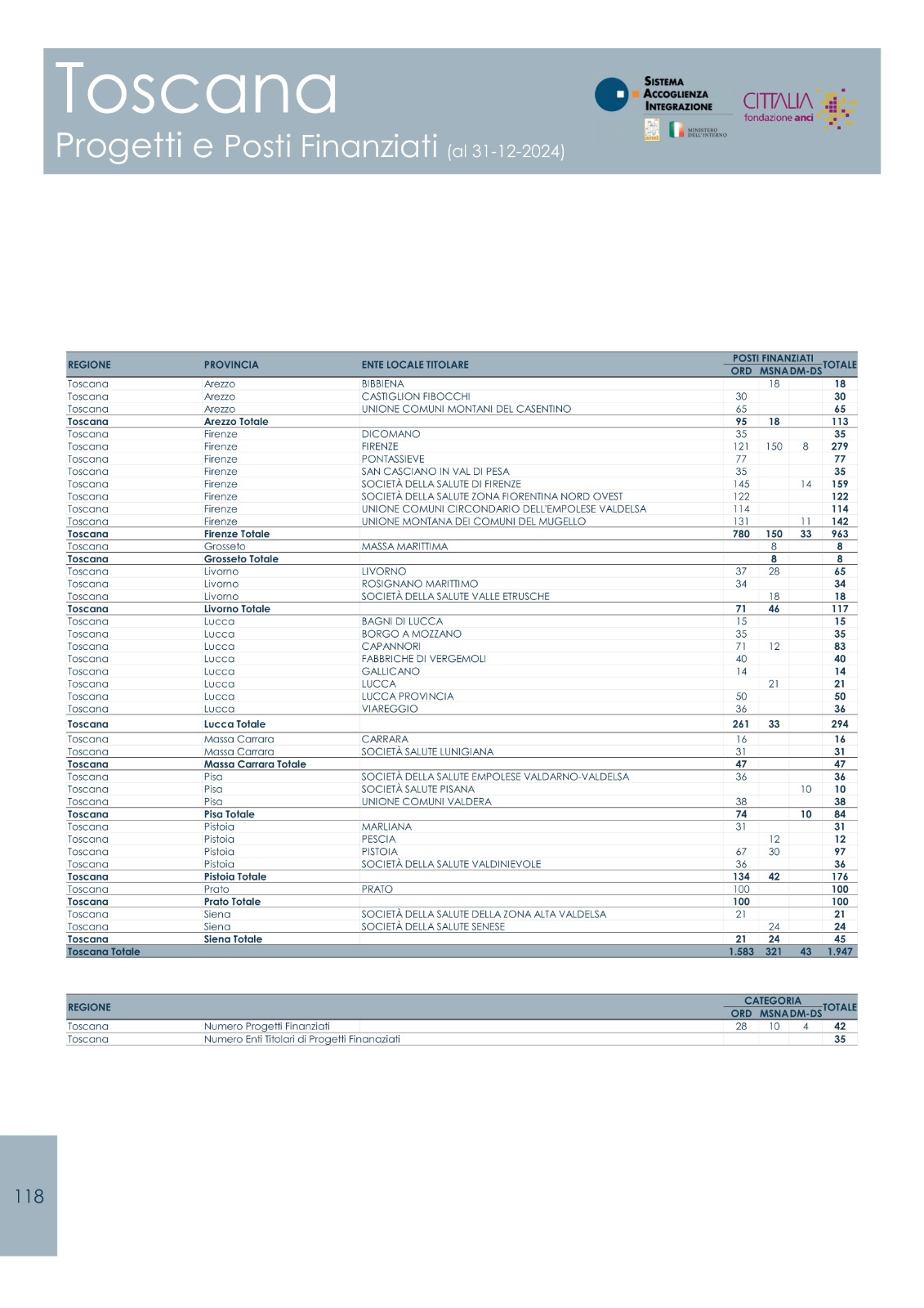 Tornando alla Toscana, i Comuni titolari di progetti di accoglienza sono Bibbiena, Castiglion Fibocchi, Firenze, Dicomano, Pontassieve, San Casciano in Val Di Pesa, Grosseto, Massa Marittima, Livorno, Rosignano Marittimo, Bagni Di Lucca, Lucca, Borgo A Mozzano, Capannori, Fabbriche Di Vergemoli, Gallicano, Viareggio, Carrara, Marliana, Pistoia, Pescia, Prato. Oltre all’Unione Comuni Montani del Casentino, Unione Comuni Circondario dell’Empolese Valdelsa e Unione Montana dei Comuni Del Mugello.
