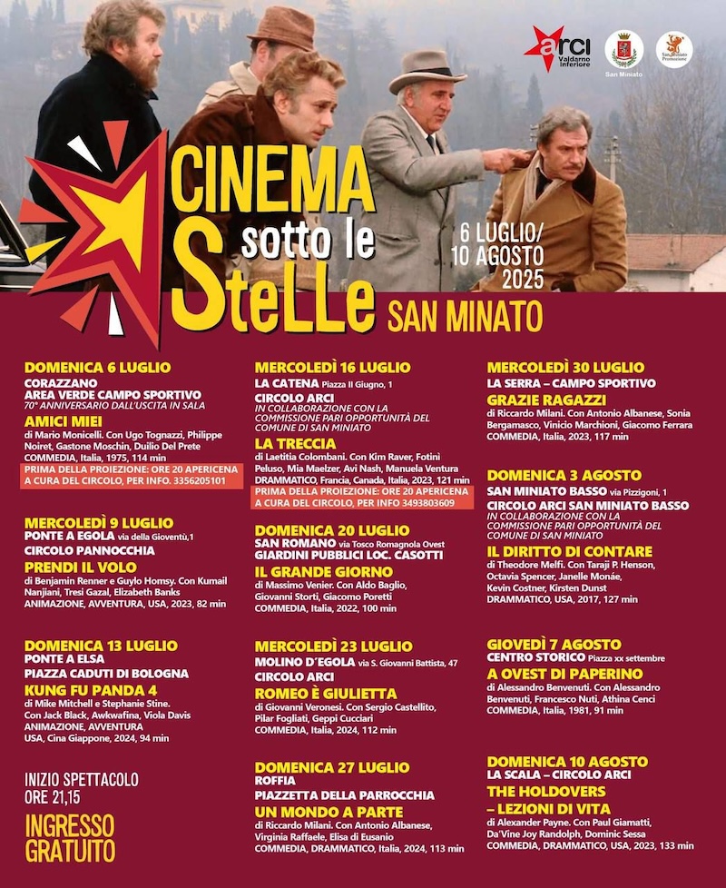 Il 3 agosto, al Circolo Arci a San Miniato Basso, verrà proiettato "Il diritto di contare", serata organizzata in collaborazione con la Commissione pari opportunità; il 7 agosto, in piazza XX Settembre a San Miniato, "Ad ovest di Paperino" e il 10 agosto, al Circolo Arci de La Scala, "The Holdovers - Lezioni di vita". Tutti gli spettacoli inizieranno alle 21.15.