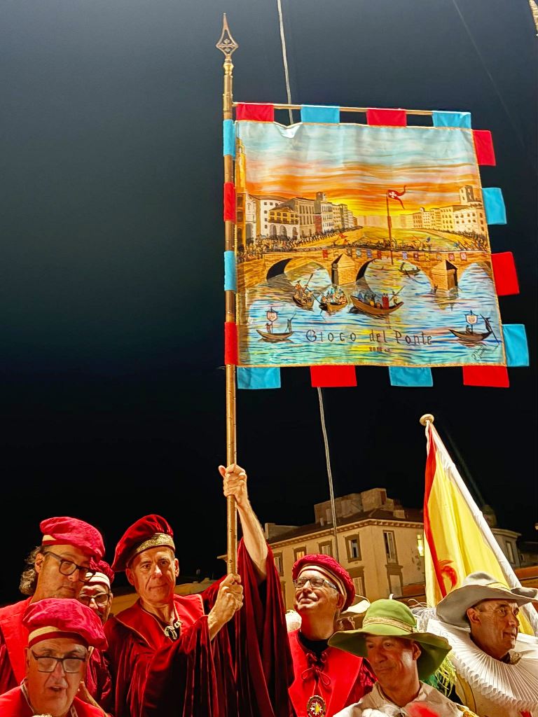 Intervento dell’assessore alle tradizioni della storia e dell'identità di Pisa, Filippo Bedini: «Sono esattamente 90 anni dalla ripresa del Gioco del Ponte e l’inizio dell’era moderna della nostra tradizione: era il 29 giugno del 1935 quando, dopo un lungo periodo di interruzione, si tornò a disputare il Corteo storico sui Lungarni e la battaglia sul Ponte. Fu un rilancio grandioso, che ha permesso al Gioco del Ponte di arrivare fino ai nostri giorni. Anche la nostra Amministrazione, nel suo piccolo, dal 2019 ha iniziato un lungo e complicato percorso di rilancio del Gioco del Ponte, un progetto funestato dalla pandemia, che ha messo a forte rischio la sopravvivenza stessa di questo tipo di eventi. Invece, siamo riusciti a “ristrutturare” il Gioco, grazie a grandissimi investimenti in termini di risorse economiche, ma anche attraverso un rilancio in termini di risorse umane coinvolte. Gli effetti di questo lavoro si iniziano a vedere: le edizioni 2023 e 2024 hanno fatto registrare molti progressi del Gioco, e l’ultimo anno che ci ha portato all’edizione 2025 è stato un anno di indubbia rilevante crescita sotto diversi punti di vista: innanzitutto la produzione e la divulgazione culturale, attraverso importanti incontri, conferenze, presentazioni di libri; poi con una rinnovata, incrementata presenza nelle scuole da parte delle Magistrature, che hanno fatto un ottimo lavoro. Il Gioco deve essere vissuto tutto l’anno e dalla città tutta: solo così potrà avere un futuro luminoso, degno del suo grande passato e noi avremo adempiuto compiutamente all’onere di “tradere”, di tramandare avendola fatta crescere, una delle più importanti tradizioni di Pisa».
