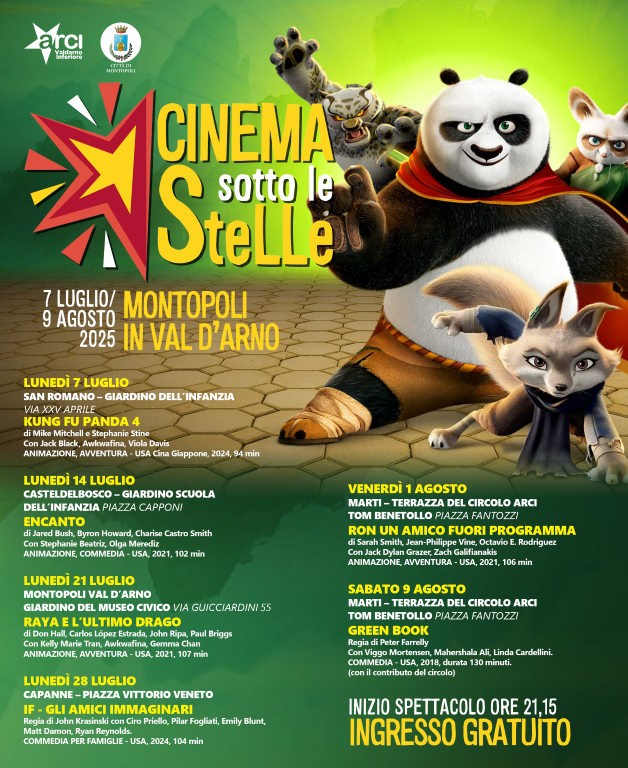 Si comincia lunedì 7 luglio, al giardino della scuola dell'infanzia di San Romano in via XXV Aprile, con un appuntamento tutto dedicato ai più piccoli e la proiezione di Kung Fu Panda 4. Si continua il lunedì successivo, 14 luglio, a Casteldelbosco, anche qui nel cortile della scuola della frazione, con il film di animazione Disney Encanto Sempre targato Disney anche l'appuntamento di lunedì 21 luglio nel Capoluogo, al giardino del Museo Civico in via Guicciardini 55, con il film animato Raya e l'ultimo drago. Sarà invece il turno di Capanne, in piazza Vittorio Veneto, lunedì 28 luglio con If - Gli amici immaginari. Il cinema continua ad agosto con un doppio appuntamento a Marti: venerdì 1 nella terrazza del circolo Arci martigiano Tom Benetollo con il film d'animazione d'avventura Ron - Un amico fuori misura e infine, per la gioia dei più grandi, sabato 9 agosto nello stesso luogo, con il film premio oscar Green Book, con Viggo Mortensen e Mahershala Ali.