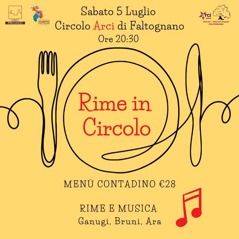 Rime in circolo, la versione più spensierata dell'edizione invernale, si ripropone al Circolo di Faltognano, sabato 5 luglio dalle 20.30 con le rime di Gabriele Ara, Fabrizio Ganugi e Silvia Bruni che declameranno in ottava rima, stornelli toscani e con l’inconfondibile spirito del Montalbano.