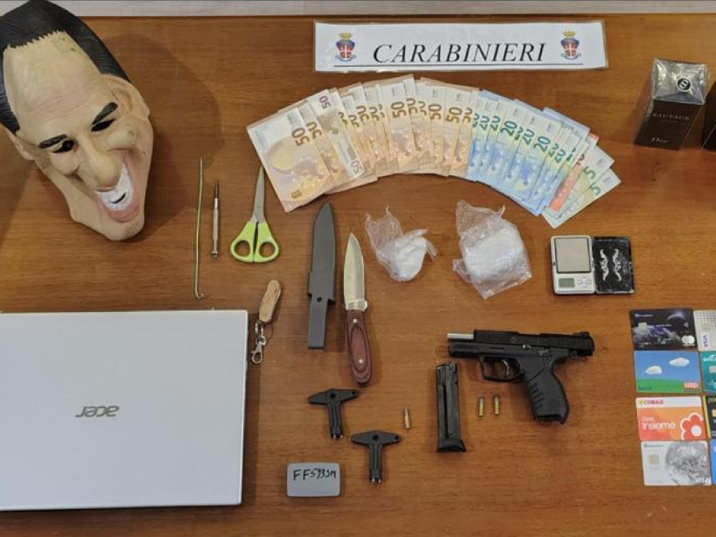 Le successive perquisizioni nell’auto e nell’abitazione hanno portato al rinvenimento di un ulteriore proiettile calibro 22, 1.020 euro in contanti, un coltello di 16 cm, attrezzi da scasso, una maschera in gomma con il volto di Silvio Berlusconi, profumi di marca, un computer portatile e carte di credito rubate nei giorni precedenti.