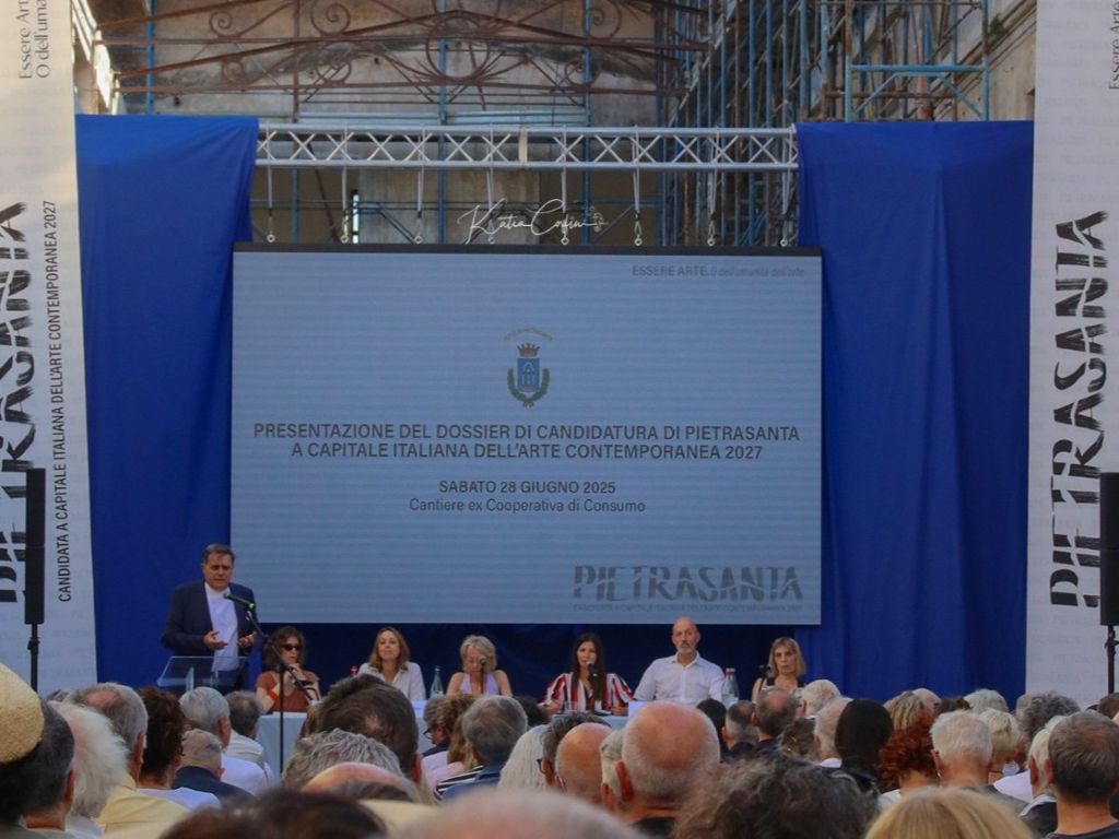 Trasformata in auditorium d'eccezione l’ex cooperativa di consumo in via Marconi, dov’è in corso un profondo intervento di rigenerazione urbana, ha disegnato una cornice intrisa di memorie e suggestioni per la presentazione alla città del dossier con cui Pietrasanta si è candidata a Capitale italiana dell'arte contemporanea 2027. La presentazione è avvenuta lo scorso sabato, 28 giugno 2025 alla presenza di esponenti delle istituzioni e del mondo della cultura