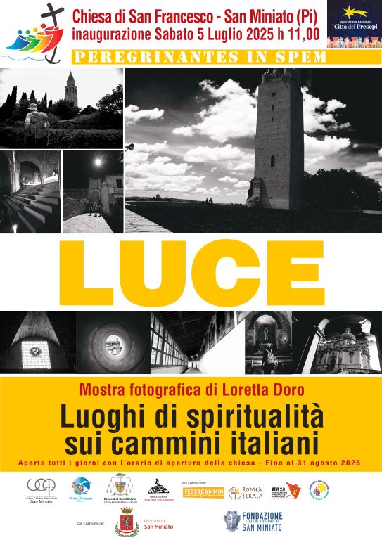 “Luce” è promossa dall’associazione nazionale Città dei Presepi, insieme a Nuovi Orizzonti, Diocesi di San Miniato Ufficio Beni artistici e culturali, Unione Cattolica Artisti Italiani, Fiera del Libro Toscano, con la collaborazione di Federcammini, Romea Strata Fondazione San Teobaldo, Via Francigena Toscana ATVF 2.0, Coordinamento Misericordie Empolese Valdelsa Valdarno con il patrocinio del Comune di San Miniato. La mostra sarà visitabile tutti i giorni fino al 31 agosto con l’orario quotidiano di apertura della chiesa.