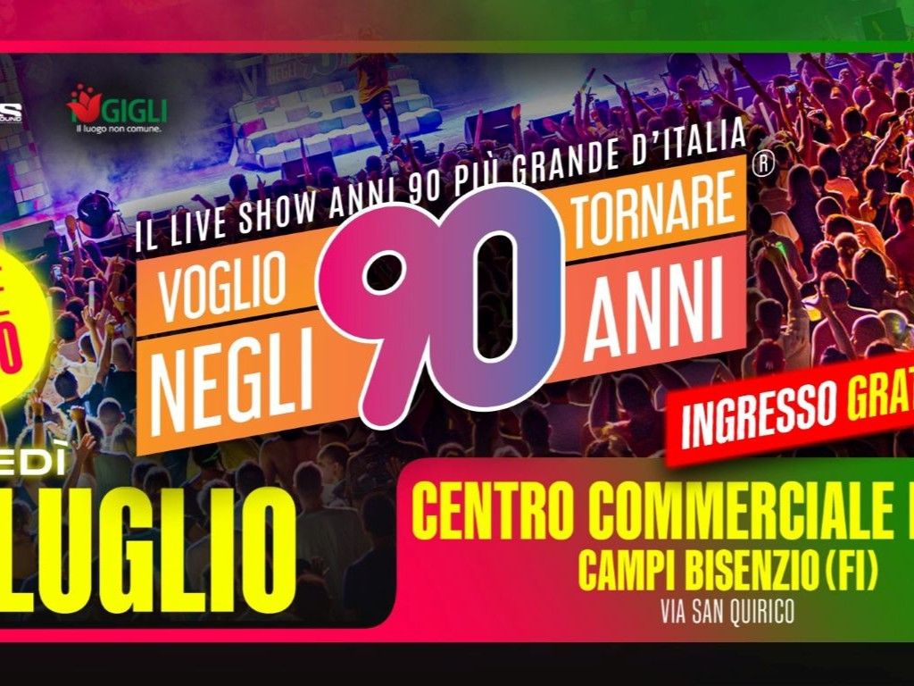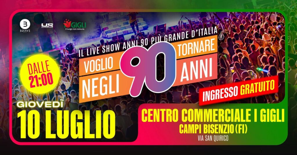 Un tuffo nella musica e nell’atmosfera degli anni ‘90: è quanto accadrà giovedì 10 luglio al Centro Commerciale I Gigli. Nella piazza esterna di Corte Tonda dalle ore 21 prenderà il via uno show live tra i più amati “Voglio Tornare Negli Anni 90®!”.