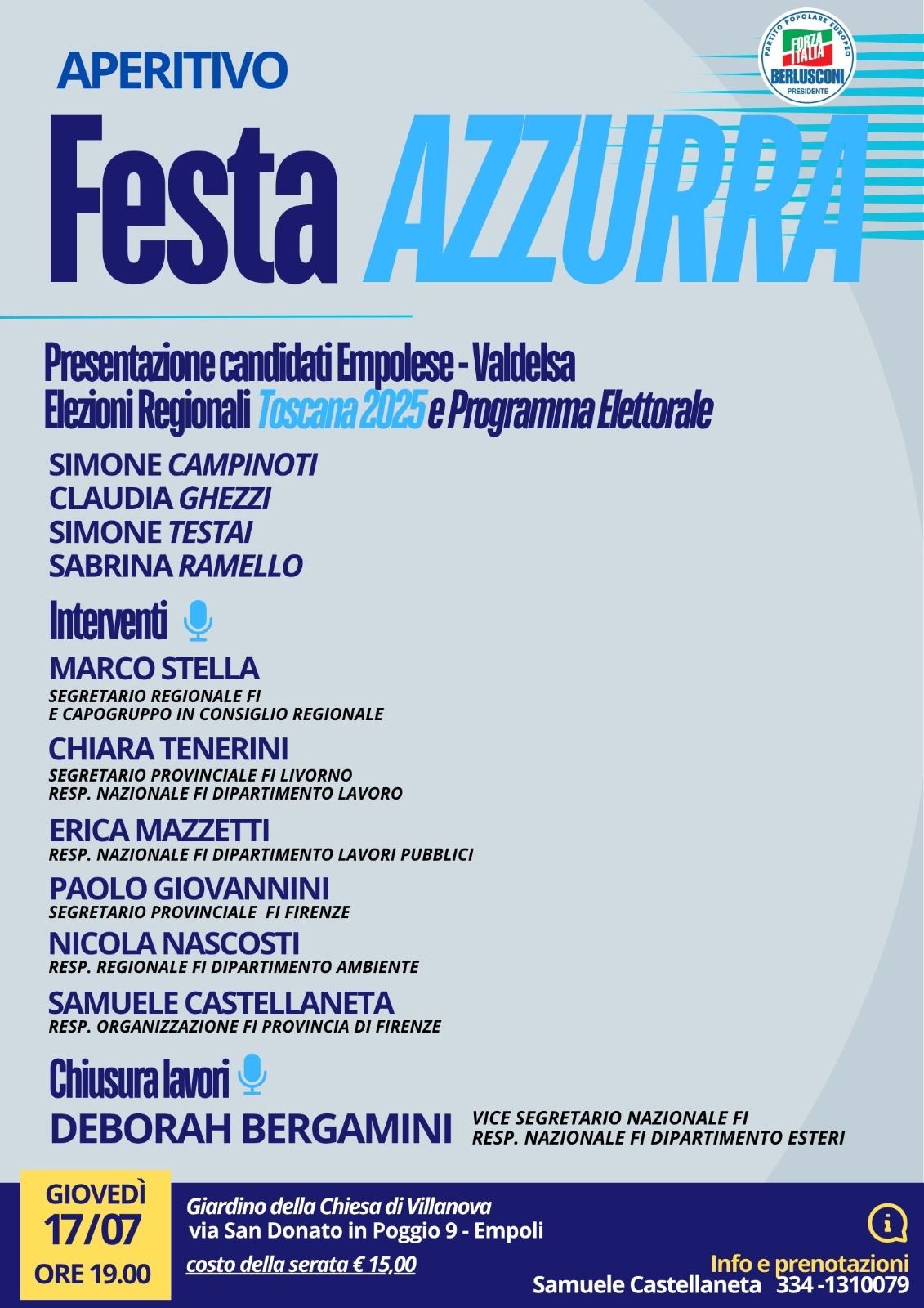 La festa verrà aperta dal segretario regionale Marco Stella, che presenterà i punti programmatici del programma elettorale di Forza Italia e i 4 candidati per l’Empolese Valdelsa alla sfida regionale Simone Campinoti, Claudia Ghezzi, Simone Testai e Sabrina Ramello. Ci saranno gli interventi anche dei parlamentari eletti in Toscana Chiara Tenerini e Erica Mazzetti e concluderà i lavori il vicesegretario nazionale Deborah Bergamini.