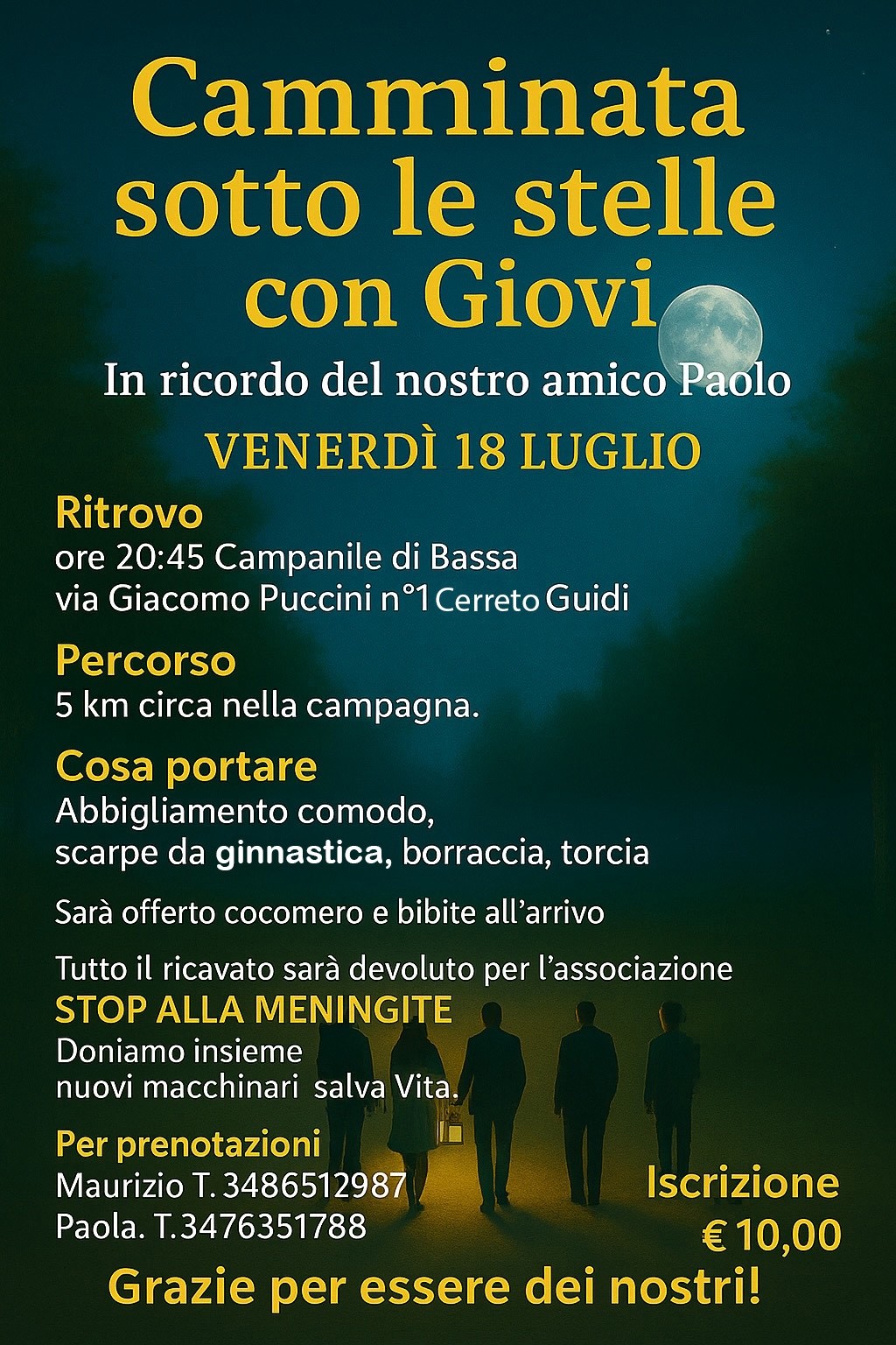 Le offerte dei camminatori per la partecipazione alla camminata saranno devolute proprio per questo. Lo scopo è quello che i nostri Ospedali siano in grado di fronteggiare al meglio ogni temibile complicanza. Invitiamo quindi la cittadinanza a telefonare per iscriversi ai numeri 3486512987 (Maurizio) o 3476351788 (Paola). La camminata sarà intervallata da momenti di approfondimento o ludico-culturali, e alla fine sarà offerta una cocomerata e bibite a tutti. Il percorso sarà di circa 5 km ed è consigliabile portare abbigliamento comodo, scarpe da ginnastica o da trekking, una borraccia e una torcia elettrica. Sarà divertente, salutare e soprattutto tanto, tanto importante.