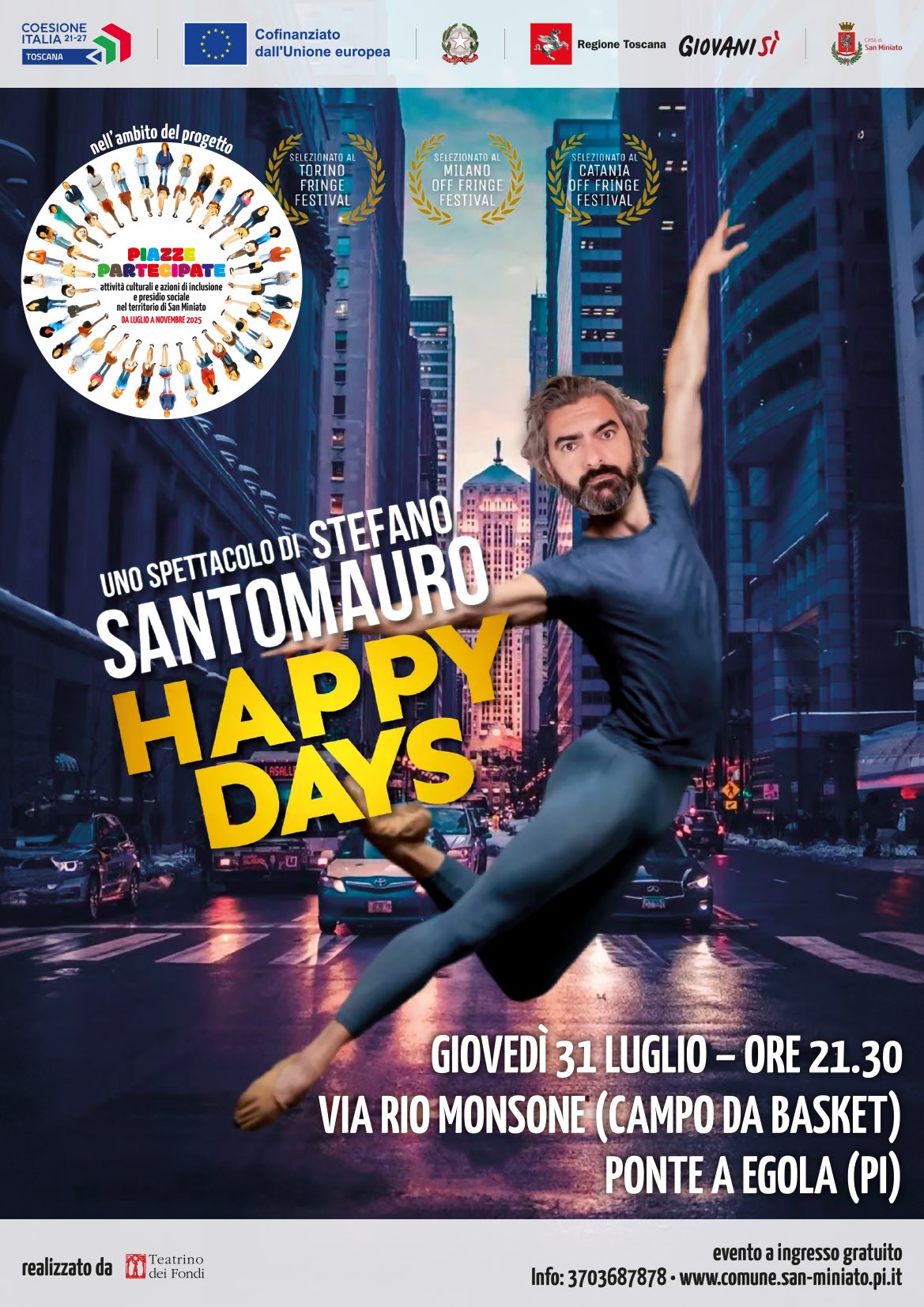 "Con lo spettacolo Happy Days di Stefano Santomauro, organizzato il prossimo 31 luglio a Ponte a Egola nell’ambito del progetto "Piazze Partecipate", diamo un segnale chiaro: l’arte può e deve essere uno strumento di coesione, partecipazione e rinascita degli spazi comuni – dichiara l’assessore alla cultura, Matteo Squicciarini -. Il campo da basket accanto alla palestra Mannucci, luogo vissuto dai più giovani ma che rischia di essere "senz'anima",