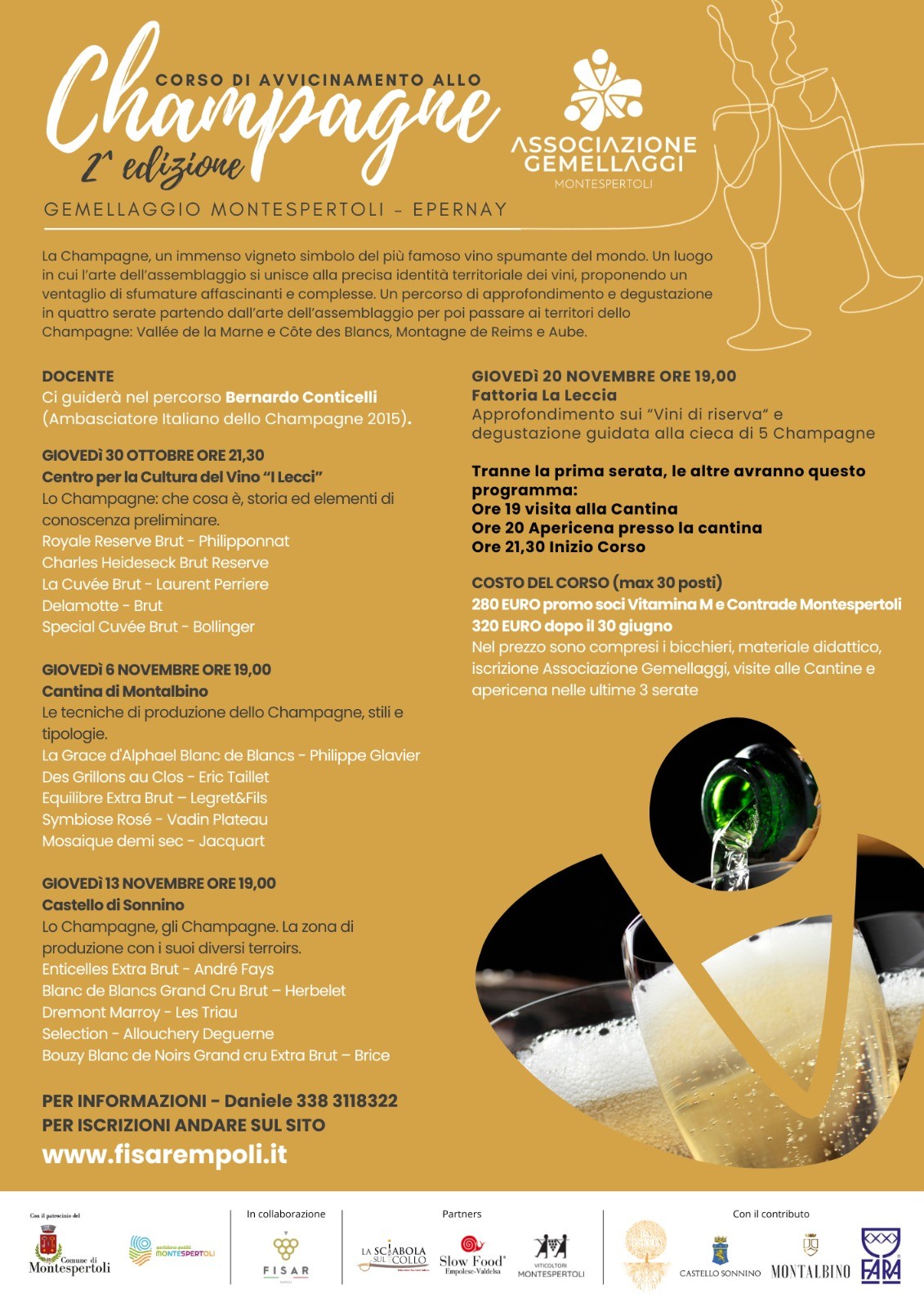 L’Associazione Gemellaggi Montespertoli, in collaborazione con FISAR Empoli e con il patrocinio del Comune di Montespertoli, presenta la seconda edizione del Corso di Avvicinamento allo Champagne, dedicato alla scoperta del vino spumante più famoso al mondo e legato al gemellaggio con la città francese di Epernay.