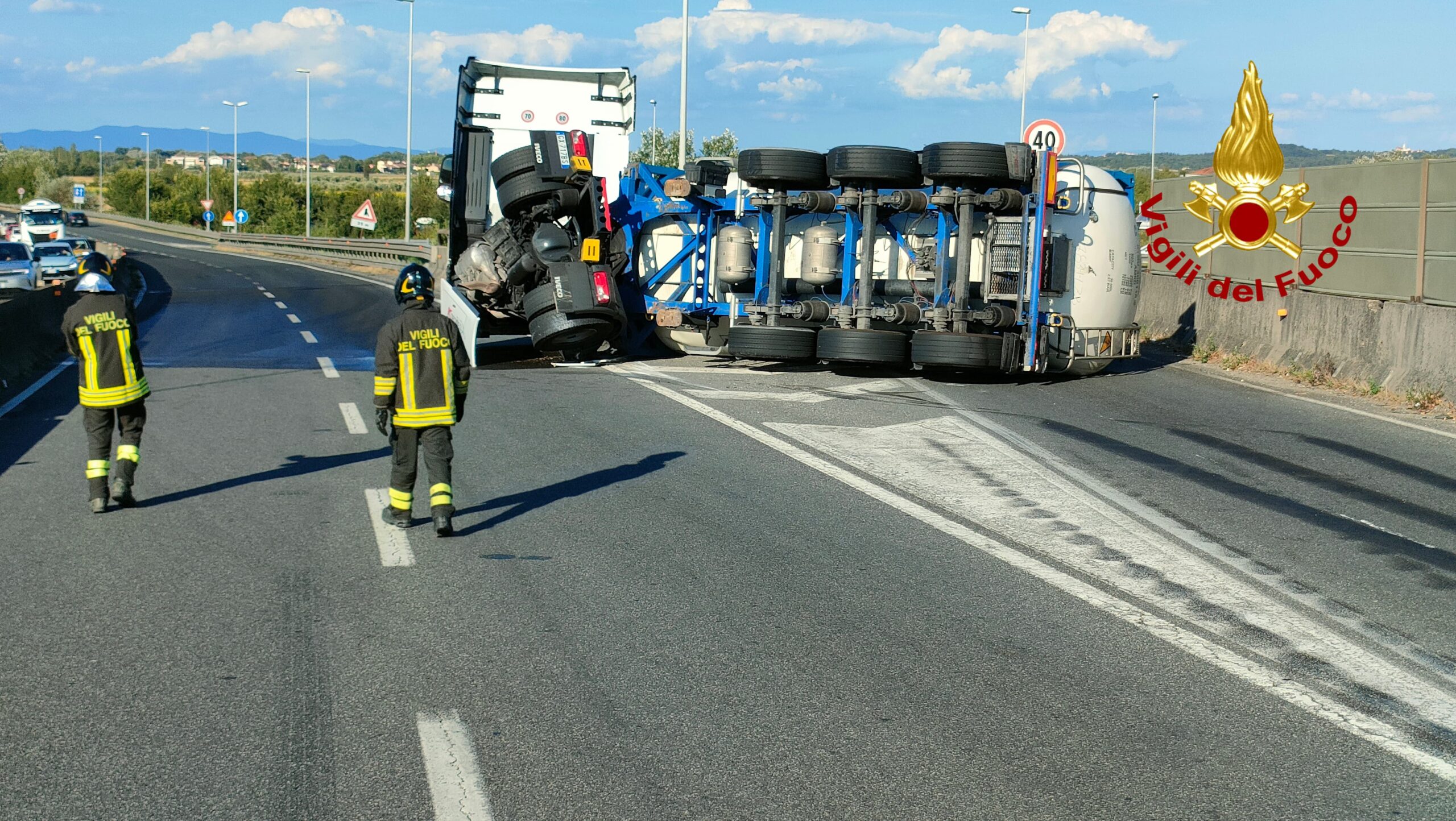 Un'autocisterna contenente olio di oliva si è ribaltata all'altezza dell'uscita di Ponsacco/Pontedera ostruendo sia la corsia di uscita che una corsia direzione Firenze. È successo sulla Fi-Pi-Li alle 17.30 circa, in direzione est.