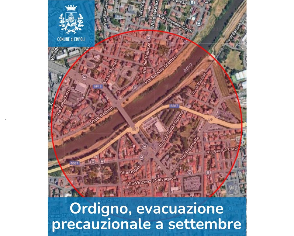 Per la sicurezza dei cittadini, in via precauzionale, sarà necessario evacuare un'area di raggio pari a 468 metri a partire dalla posizione dell'ordigno bellico, così come rappresentato nella mappa, che interessa i territori comunali di Empoli e di Vinci. Nell'area vive un totale di quasi 5mila residenti, 3.800 circa su Empoli e 1.200 circa su Vinci, che sono chiamati a evacuare l'area per il tempo necessario alle operazioni.