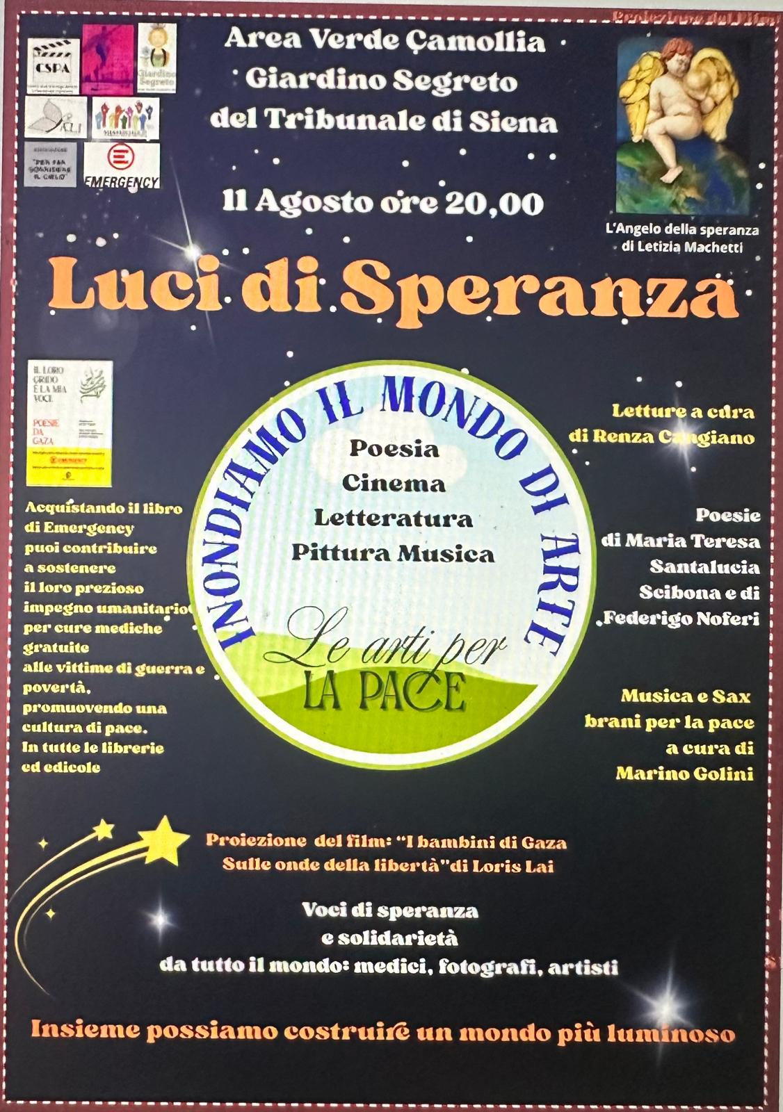 L’evento vedrà la partecipazione di medici, fotografi e artisti, che parleranno di pace nel mondo e di come possiamo contribuire a costruire ponti di speranza. In particolare interverranno fotografi che hanno realizzato reportage ai bambini di tutto il mondo e medici che si spendono per sostenere le popolazioni colpite dalla guerra e dalla povertà. Le letture sono a cura di Renza Cangiano, mentre Marino Golini accompagnerà con brani per la pace al sax e voce. Non mancheranno le poesie di Maria Teresa Santalucia Scibona e Federigo Noferi, che ci invitano a riflettere e a sognare un mondo migliore. Il dipinto di Letizia Marchetti dedicato all’Angelo della Speranza arricchisce di significato il termine stesso e la partecipazione di ALI Artisti Liberi Indipendenti di cui è Presidente Ornella Francini, rende l’arte mezzo e strumento per diffondere la pace nel mondo.