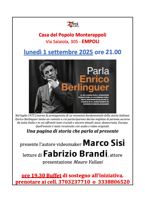 L’incontro può esser considerato anche un’iniziativa collaterale della grande mostra “I luoghi e le parole di Enrico Berlinguer” che si svolgerà da mercoledì 3 settembre a domenica 5 ottobre 2025 al Mandela Forum di Firenze (dove sarà presentato anche questo filmato) ed anche in preparazione della Marcia della Pace Empoli-Monterappoli che si terrà la sera di sabato 5 settembre.