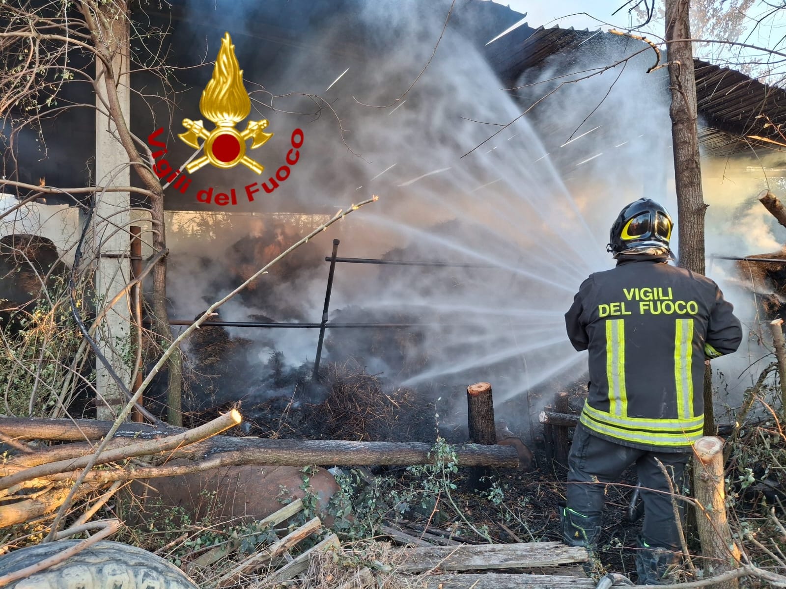 Le fiamme, partite da un campo e alimentate dal forte vento, si sono estese a un capanno utilizzato come magazzino per rotoballe e attrezzi agricoli, coinvolgendo anche un mezzo agricolo.
