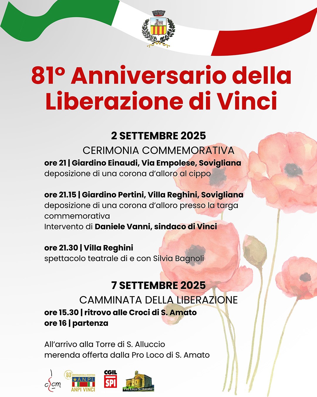 Il 2 settembre 1944 Vinci viene liberata dal giogo nazifascista. A 81 anni da quel giorno, come ogni anno, l’amministrazione comunale organizza due giornate di cerimonie per commemorare l’avvenimento e i protagonisti di quella conquista.
