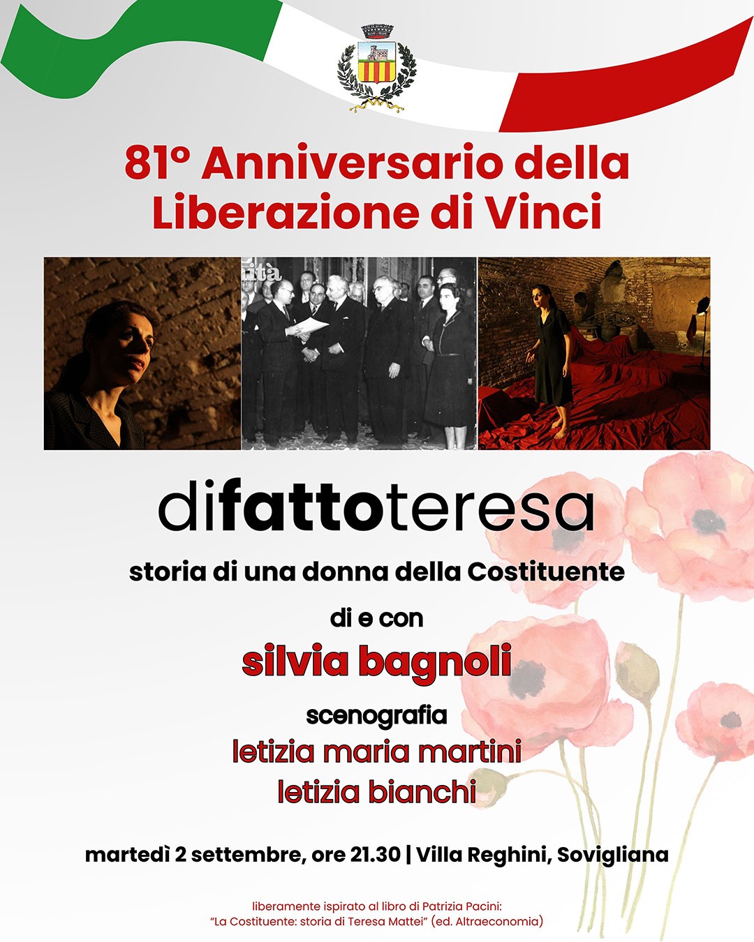 Infine, la serata si chiude con “Di fatto Teresa”, lo spettacolo teatrale di e con Silvia Bagnoli, dedicato a Teresa Mattei, anche la più giovane eletta all'Assemblea Costituente, dove assunse l'incarico di segretaria dell'ufficio di presidenza. Lo spettacolo (Villa Reghini, alle 21.30), la cui scenografia è curata da Letizia Maria Martini e Letizia Bianchi, è liberamente ispirato al libro di Patrizia Pacini, “La Costituente: storia di Teresa Mattei” (ed. Altraeconomia).