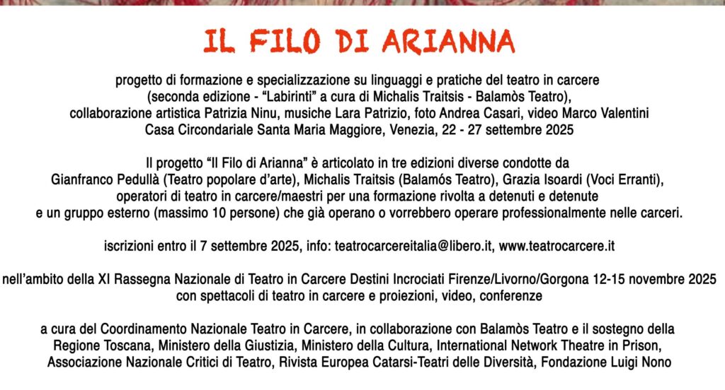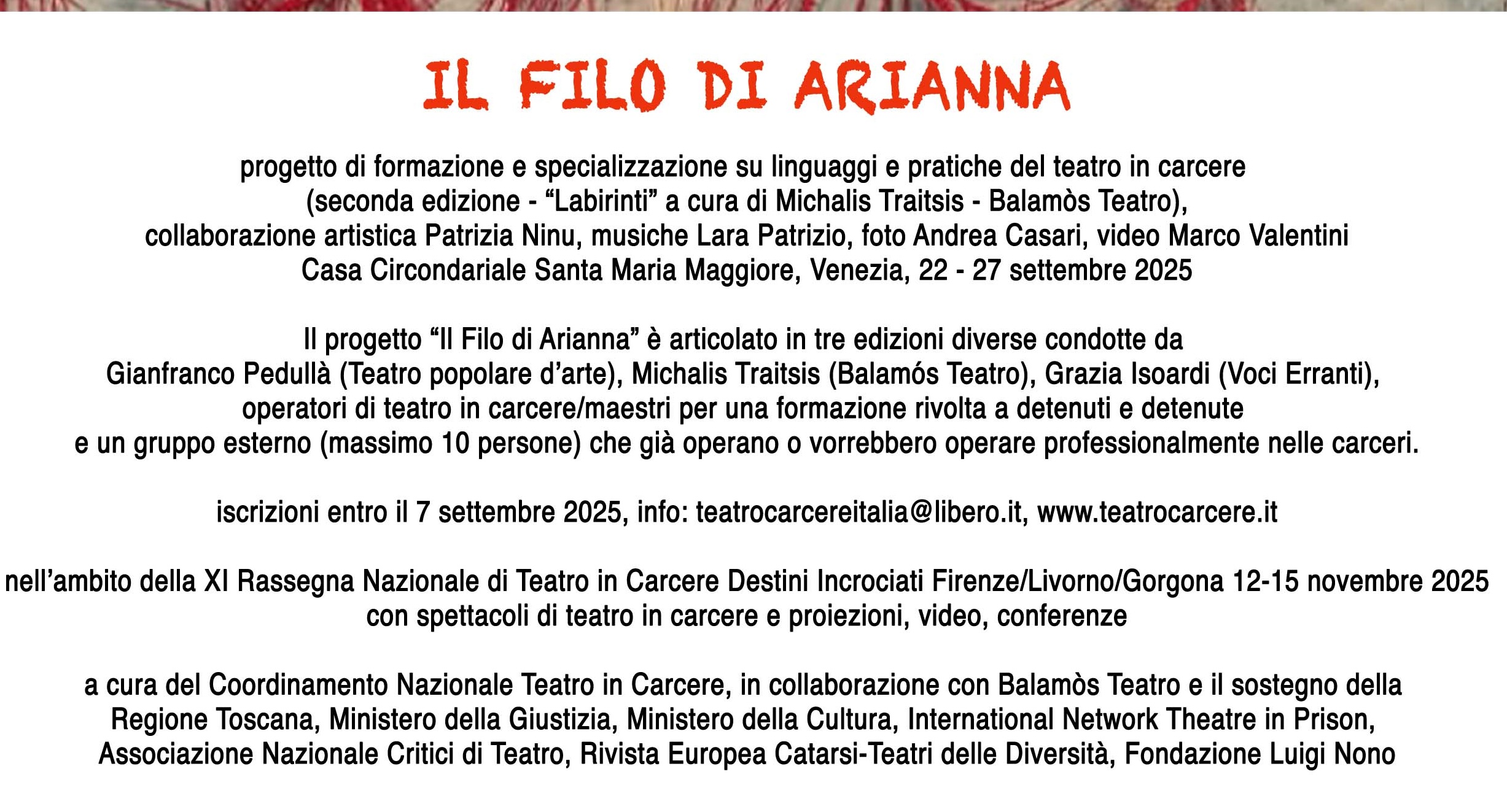Il laboratorio, chi si svolgerà alla Casa Circondariale Santa Maria Maggiore di Venezia dal 22 al 27 settembre 2025, è la seconda parte de Il filo di Arianna, progetto triennale a cura del Teatro Popolare d’Arte e del Coordinamento Nazionale Teatro in Carcere per il Programma di rassegna itinerante pluriennale "DESTINI INCROCIATI”.