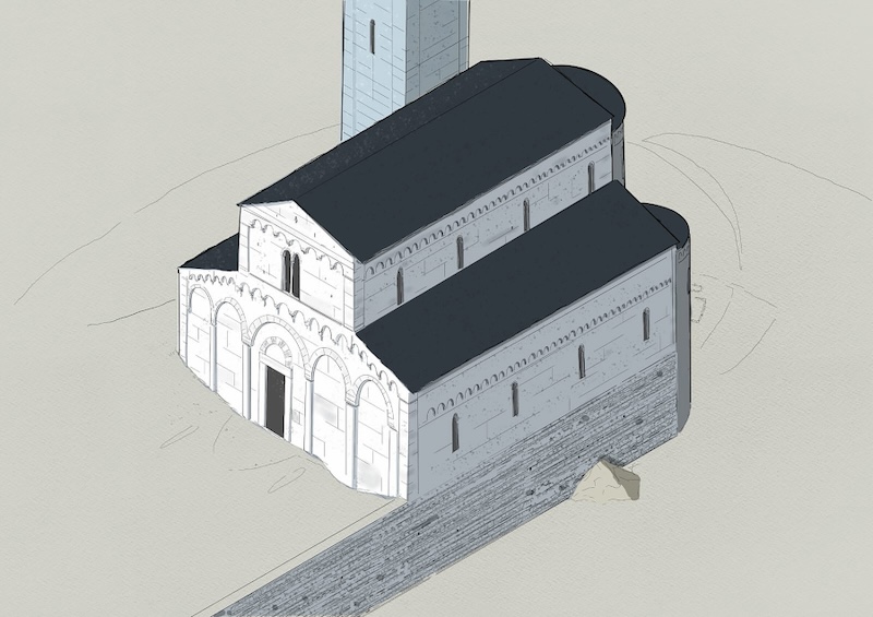 Ricostruzione della pieve di Gallicano nel XII secolo (disegno Alan Farnocchia)