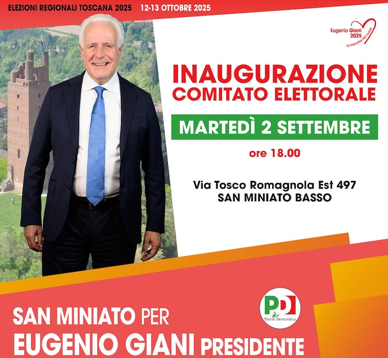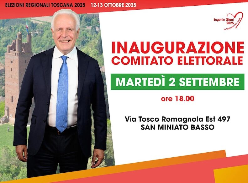 San Miniato sarà il cuore della prossima campagna elettorale per le elezioni regionali 2025, con l’inaugurazione del primo comitato elettorale di Eugenio Giani, “San Miniato per Eugenio Giani Presidente”, che si terrà martedì 2 settembre alle ore 18:00 in Via Tosco Romagnola Est 497, San Miniato Basso.