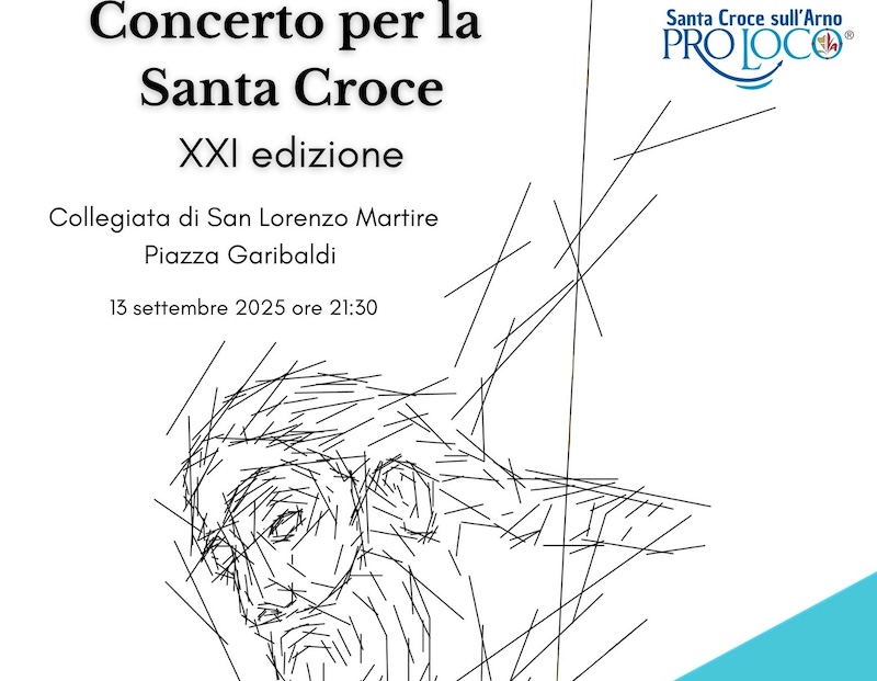 Sabato 13 settembre 2025 alle ore 21:30 nella Collegiata di San Lorenzo a Santa Croce Sull’Arno (Piazza Garibaldi) la Pro Loco organizzerà la 21esima edizione il concerto per la Santa Croce. Nato come evento culturale che intendeva promuovere il Crocifisso ligneo del 13esimo secolo, ubicato da sempre all’interno della nostra Collegiata, il concerto è diventato una tradizione che tutti gli anni si ripete e si rinnova con musiche e musicisti di diverso genere.