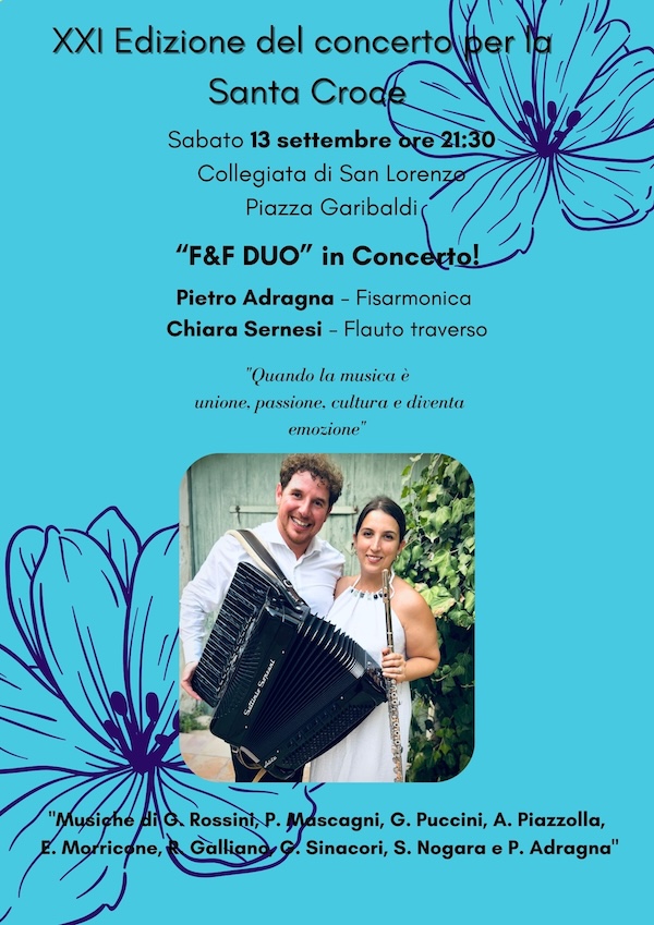 Quest’anno protagonista della serata sarà Pietro Adragna, fisarmonicista di fama internazionale non nuovo alla Toscana né tantomeno a Santa Croce Sull’Arno, dove è stato presente in altre occasioni. Nel 2009 Pietro Adragna viene proclamato per la prima volta campione del mondo di fisarmonica al Trofeo Mondiale CMA, tenutosi ad Albufeira in Portogallo replicando lo straordinario successo alla Coppa Mondiale CIA del 2011, svoltasi in Cina, dove ha vinto nella categoria “Virtuoso Entertainment Music” e nella categoria “Digital Accordion”. È stato anche protagonista due anni fa a Lajatico alla corte di Andrea Bocelli e l’anno scorso a Pisa a “Musica sotto la torre”, con la direzione artistica del Maestro Riccardo Donati. Quest’anno Adragna ha accettato il nostro invito a Santa Croce Sull’Arno con una formazione inedita: “F&F Duo”, fisarmonica e flauto traverso, di Pietro Adragna e Chiara Sernesi, preannunciando così anche quest’anno un concerto di assoluta qualità. I due musicisti fra l’altro, arriveranno a Santa Croce Sull’Arno dopo una lunga tournée estiva in molte città d’Italia e d’Europa.