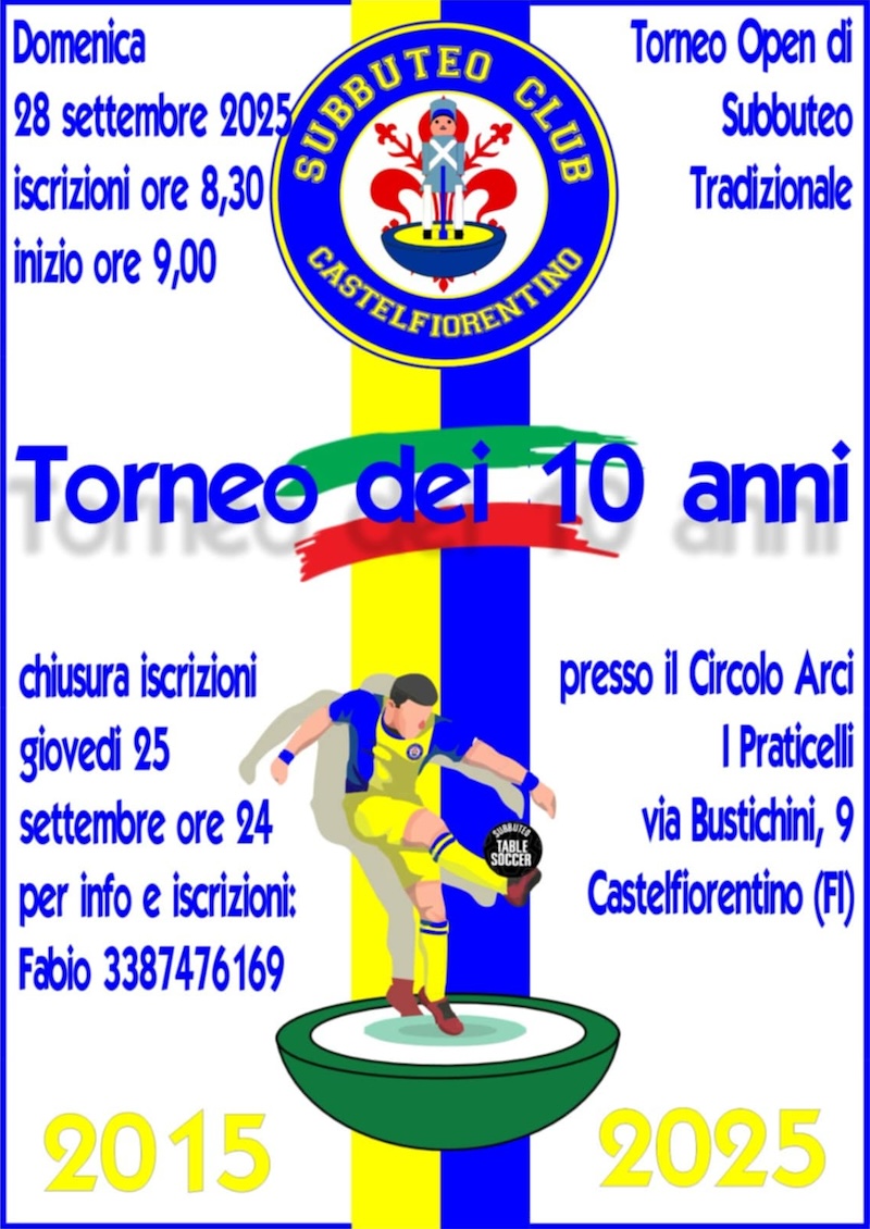 Compie dieci anni il Subbuteo Club Castelfiorentino, nato e composto da decine di appassionati del calcio da tavolo ma anche da giocatori nei panni di veri e propri atleti, protagonisti di gare nazionali e internazionali. Un importante traguardo che sarà festeggiato con un torneo open di Subbuteo tradizionale, per spegnere le candeline in compagnia di altri club che arriveranno per l'occasione nell'Empolese Valdelsa: "Nel tempo il gruppo è cresciuto, ora siamo un club affermato, sono tre anni che sfioriamo la serie B" dice il vicepresidente e tesoriere Fabio Pasquini, "ad oggi siamo circa una ventina di soci. Siamo un bel club, ci sono anche ragazzi giovani".