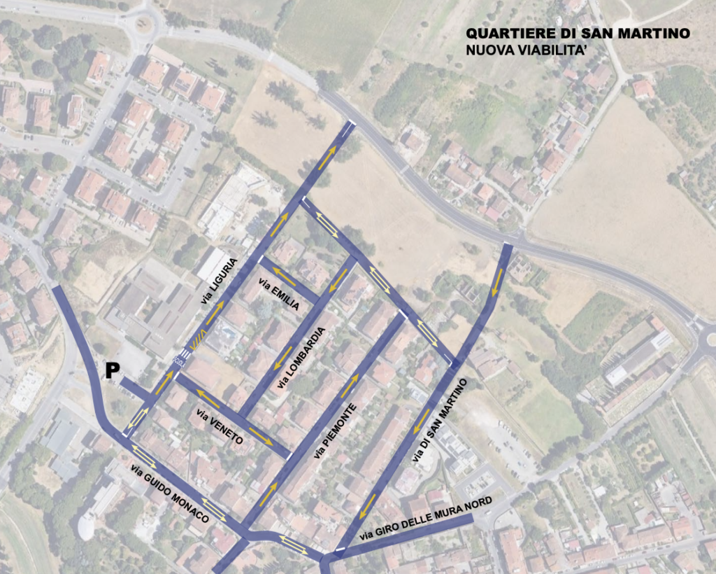 e) Via di San Martino: senso unico di marcia in direzione di via Giro delle Mura Nord, dall’intersezione con via Serravalle a San Martino;