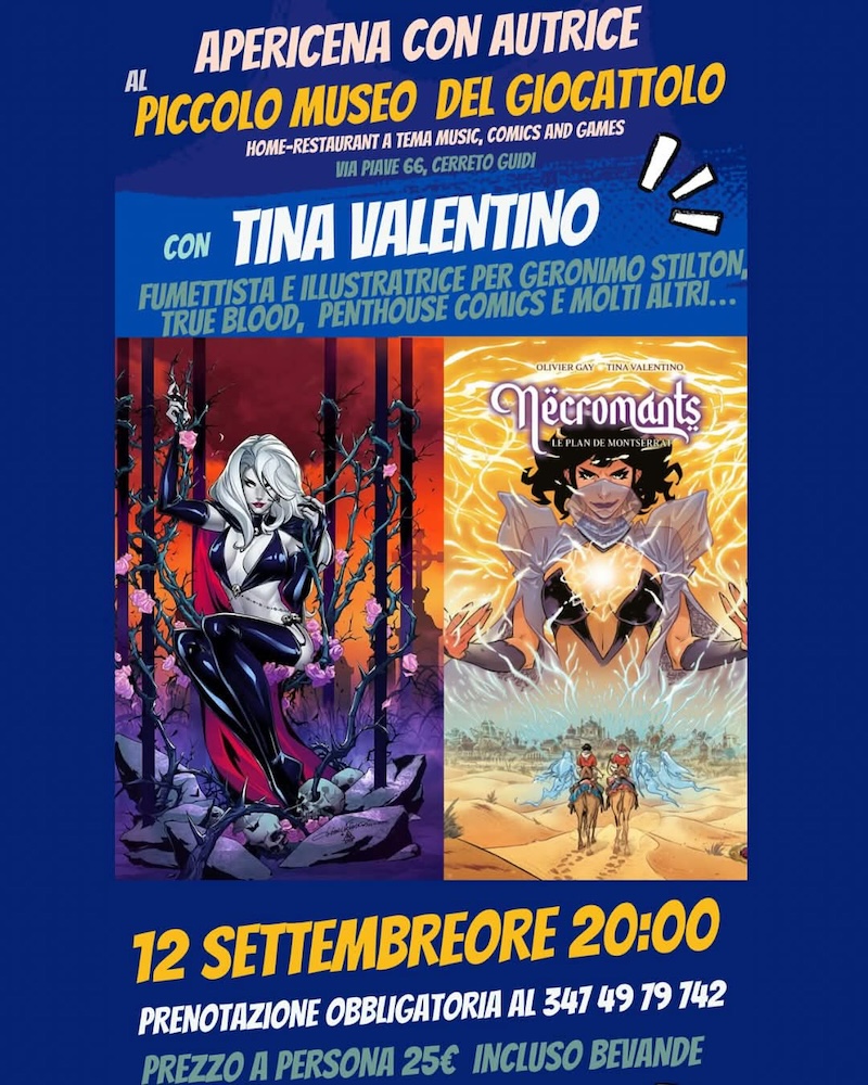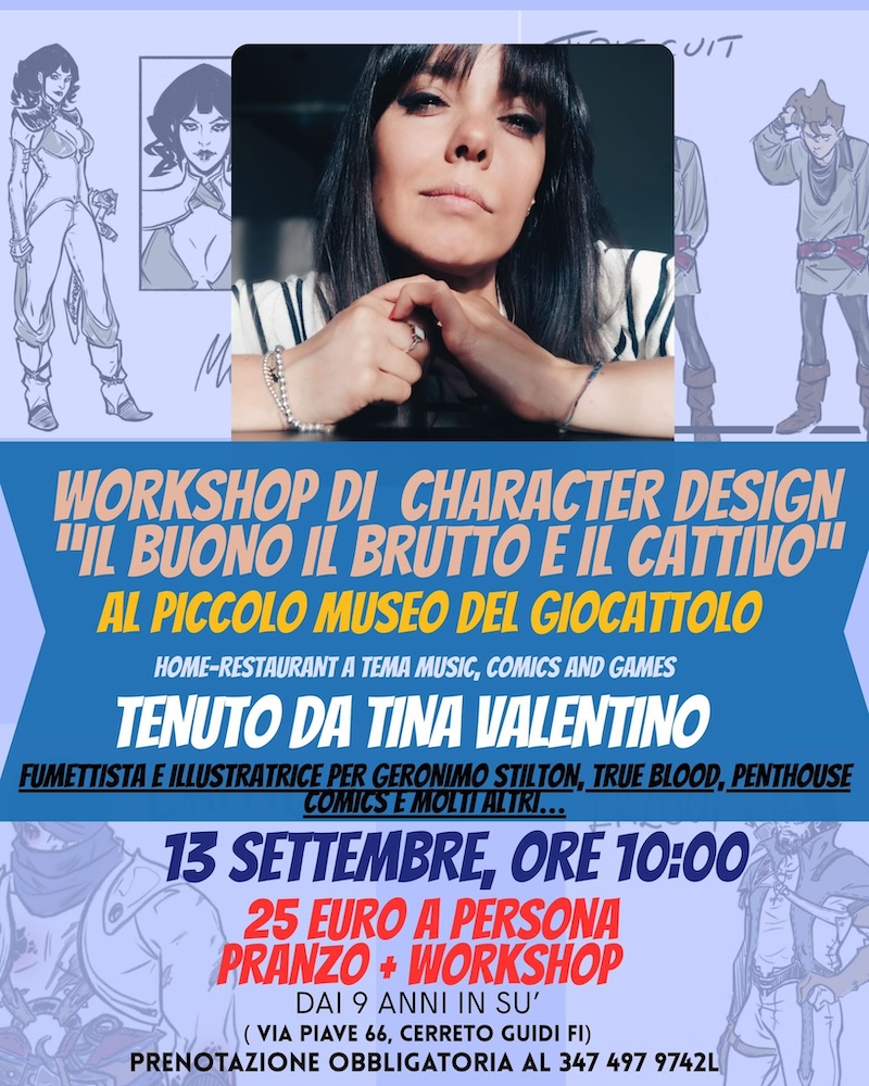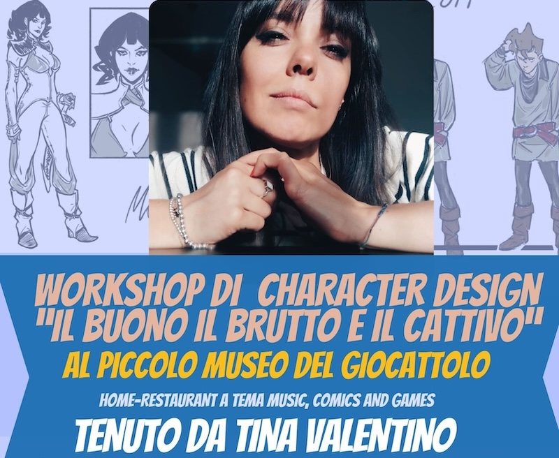 Venerdì 12 settembre, alle ore 20, in programma apericena con l'autrice. Sabato 13 settembre alle 10 Workshop di Character Design con Tina Valentino e pranzo al Piccolo Museo del Giocattolo. Prenotazione obbligatoria al 3474979742.