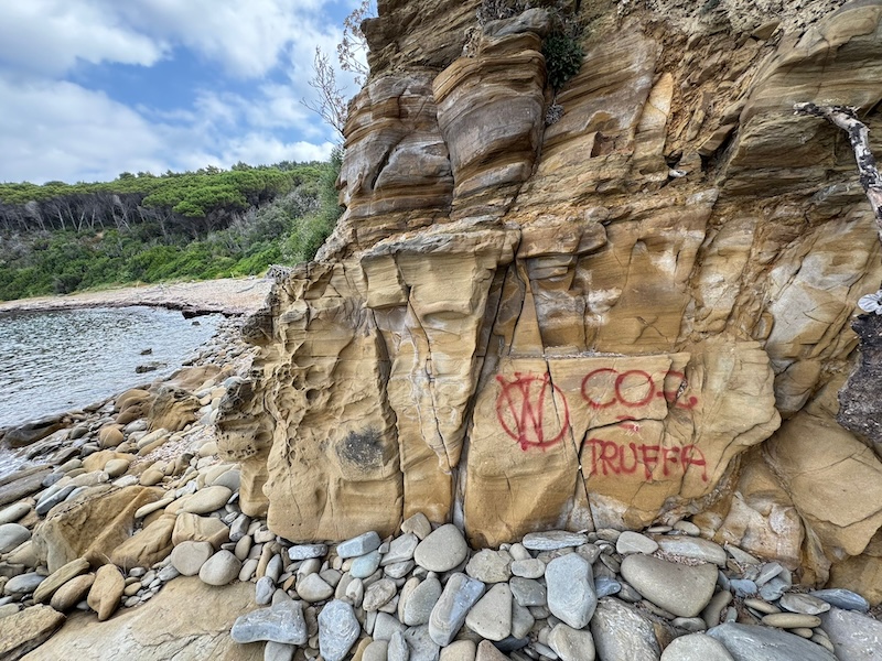 Cala Martina, uno dei luoghi più suggestivi della costa maremmana, a nord di Grosseto, è stata nuovamente presa di mira dai vandali. Nella notte ignoti hanno imbrattato gli scogli con frasi e simboli di matrice no vax, ripetendo un gesto analogo a quello compiuto circa un mese fa, quando la stessa area era stata deturpata con vernice rossa.