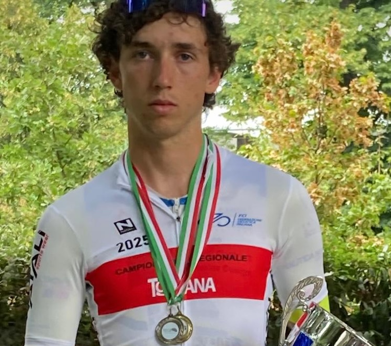 Il giovane montemurlese Pietro Menici, 17 anni, conquista il titolo di Campione Regionale a cronometro juniores ai campionati toscani di crono che si sono svolti a Firenze a fine agosto. Il percorso, tecnico e selettivo, ha messo alla prova anche i favoriti della vigilia, ma Pietro ha saputo affrontare la gara con intelligenza e coraggio, gestendo al meglio le proprie energie e facendo segnare uno dei migliori tempi assoluti 20’47”512. La sua prova a cronometro è stata costante, precisa e determinata, segno di una preparazione curata nei minimi dettagli insieme al team tecnico del Casano Stabbia di Fucecchio, nel quale il giovane atleta milita. Pietro è arrivato appena dietro a Giacomo Sgherri (Team Vangi Il Pirata), vincitore della gara, ma è riuscito comunque a conquistare il titolo toscano. Pietro Menici, insieme al fratello Duccio 14 anni, si è avvicinato al ciclismo durante il periodo del Covid, appena cinque anni fa, ed ha militato prima con la società ciclistica Borgonuovo e poi con una società ciclistica di Montecatini per poi passare nella categoria Juniores con il Casano Stabbia. Un vero talento delle due ruote che sa unire concentrazione, forza e resistenza.