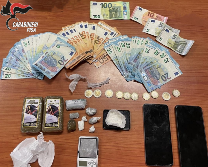 Grazie all'illuminazione stradale, i militari sono riusciti a riconoscere il fuggitivo, già noto per reati contro il patrimonio e lo spaccio di droga. Dalla perquisizione dell'auto abbandonata sono stati trovati e sequestrati 2.220 euro in contanti, due panetti di hashish per un peso complessivo di circa 210 grammi, tre dosi di cocaina per un totale di 8 grammi, un bilancino di precisione e due telefoni cellulari.