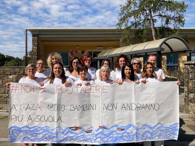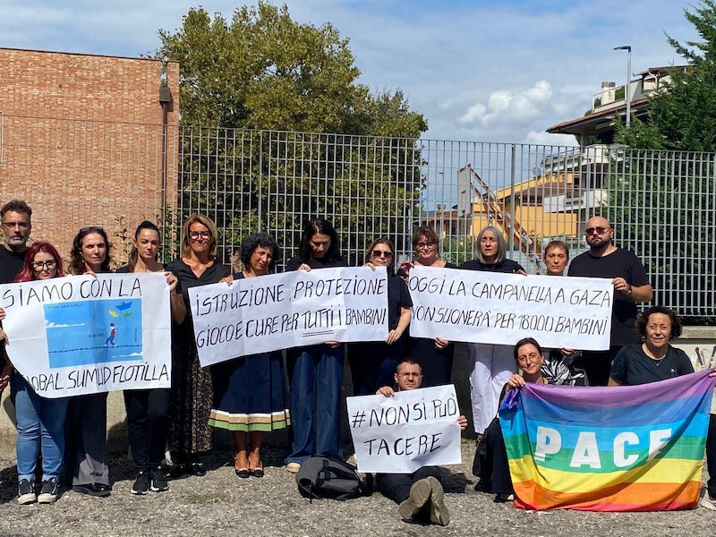 "Oggi la campanella a Gaza non suonerà per 18000 bambini". Questa una delle scritte su striscioni e cartelli esposti oggi da docenti e personale Ata di alcune scuole di Empoli. L'iniziativa si è svolta nel primo giorno di scuola, lunedì 15 settembre, fuori dai plessi: "Con questo semplice gesto noi insegnanti, Ata, educatori, intendiamo esprimere piena solidarietà al popolo palestinese e alla Global Sumud Flotilla che sta navigando con quel poco che resta della nostra umanità", spiegano in una nota.