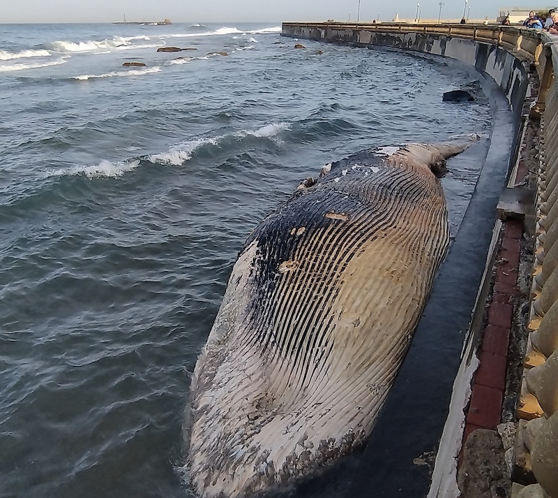 Questa mattina la carcassa di una balenottera comune si è spiaggiata sulla scogliera di fronte alla Terrazza Mascagni, a Livorno. Si tratta di un esemplare di circa 14 metri, che presenta segni di decomposizione.