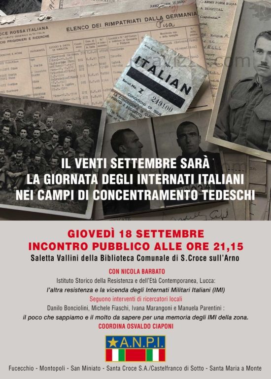 In occasione della Giornata degli Internati Italiani nei campi di concentramento, le sezioni ANPI di Fucecchio, Montopoli, San Miniato, Santa Croce sull’Arno, Castelfranco di Sotto e Santa Maria a Monte organizzano un incontro pubblico giovedì 18 settembre alle 21.15 nella saletta Vallini della Biblioteca Comunale di Santa Croce sull’Arno.