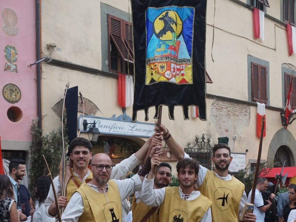 Oltre tremila i biglietti strappati all’ingresso per i due giorni di festa. Montopoli Medioevo è anche competizione a colpi di arco e frecce tra le due contrade di Perinsù e Peringiù. Il cencio 2025 è andato agli arcieri di Peringiù (con i colori giallo e nero) che hanno ottenuto il punteggio di 97 contro i 94 di Perinsu. Riccardo Caponi è stato incoronato come miglior arciere della competizione. Presente alla festa Kathryn Paul, consigliera comunale delegata ai gemellaggi della cittadina francese di Valbonne, comune gemellato con Montopoli.