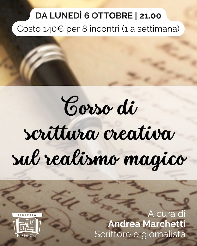 In partenza a ottobre alla libreria NessunDove a Empoli, il corso di scrittura creativa "Fantastico Quotidiano" con lo scrittore e giornalista Andrea Marchetti. Al via lunedì 6 ottobre (e per i 7 lunedì a seguire) dalle 21 alle 23. Il corso, che necessita di un minimo di iscritti per poter partire, ha un costo totale di 140 euro (30 euro di caparra per iscriversi). Previsti 8 incontri dalla durata di due ore a tema realismo magico: "Fantastico Quotidiano".