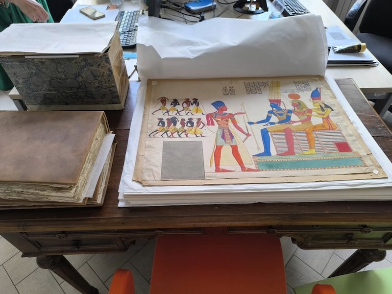 L’Egittologia con Rosellini infatti non si fermò alle lezioni. Insieme a Champollion, lo studioso pisano progettò un affascinante viaggio scientifico nella Valle del Nilo, finanziato dal granduca di Toscana Leopoldo II e da Carlo X di Francia. La celebre Spedizione franco-toscana del 1828-1829 fu la prima missione egittologica vera e propria mai realizzata. Rosellini e Champollion portarono con loro disegnatori che avevano il compito di documentare alla perfezione il materiale preso dalle pareti di templi e tombe. La parte toscana della spedizione arrivò nel porto di Livorno tra novembre e dicembre del 1829 con circa 2.000 reperti per il Museo Archeologico di Firenze e uno straordinario patrimonio di documenti, oggi conservato presso la Biblioteca Universitaria di Pisa: oltre 20.000 carte, tra quaderni di appunti, note manoscritte, lettere, testi e oltre mille meravigliosi disegni, molti dei quali acquarellati che saranno in mostra a Pisa per questo bicentenario.
