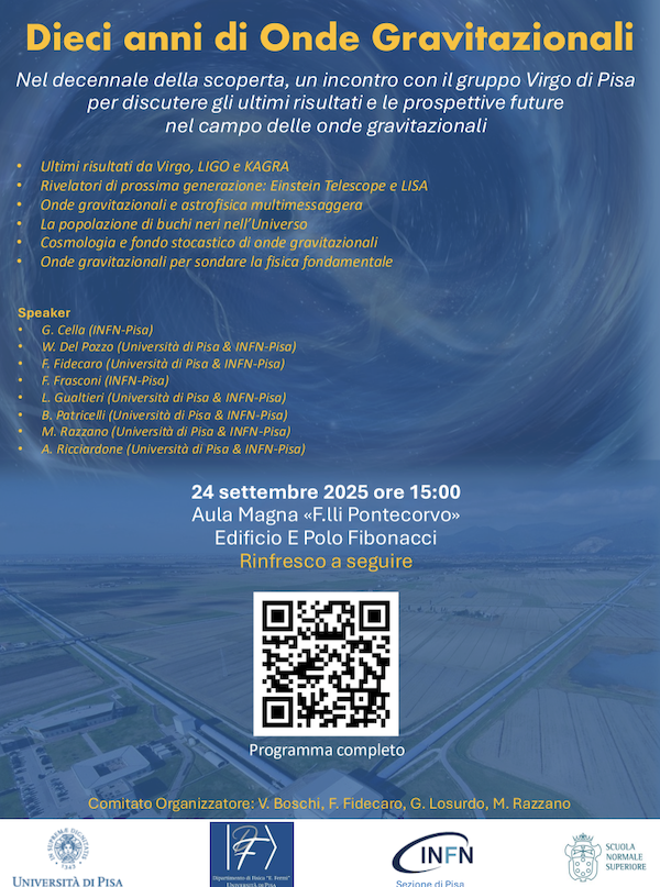 Dieci anni fa, il 14 settembre 2015, veniva rivelato il primo segnale di onde gravitazionali, una scoperta che ha rivoluzionato il nostro modo di osservare l’Universo e studiare la gravità, la forza che governa e modella l’evoluzione del cosmo. Uno dei più grandi successi nella fisica moderna, che ha portato al premio Nobel per la Fisica nel 2017. Per celebrare l’anniversario, mercoledì 24 settembre, a partire dalle ore 15, nell'Aula Magna "Bruno Pontecorvo" del Polo Fibonacci, si terrà un pomeriggio di studi dal titolo "Dieci anni di onde gravitazionali: ultimi risultati e prospettive future". L'evento vedrà la partecipazione di studenti e ricercatori dell’Università di Pisa, della Sezione INFN di Pisa e della Scuola Normale Superiore, per discutere le scoperte fatte finora e le prospettive aperte per i prossimi anni in questo nuovo e affascinante campo di studio del cosmo.