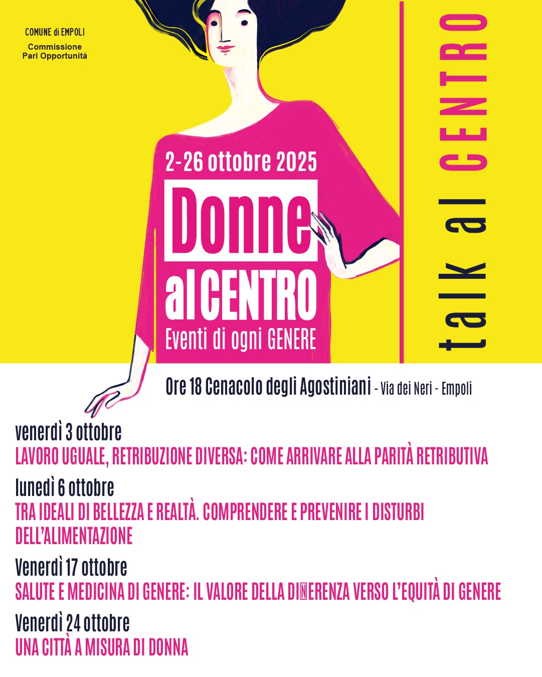 Ritorna Donne al Centro, un mese intero di eventi dedicato alla sensibilizzazione sulle tematiche di genere, organizzato dalla Commissione Pari Opportunità del Comune di Empoli in accordo con la giunta comunale. Gli eventi ricadranno su ottobre, mese dedicato da sempre alla prevenzione e alla ricerca scientifica delle malattie femminili, celebrato con iniziative come Ottobre Rosa. Il manifesto rinnovato per questa edizione è a cura dell'artista Camilla Garofalo.