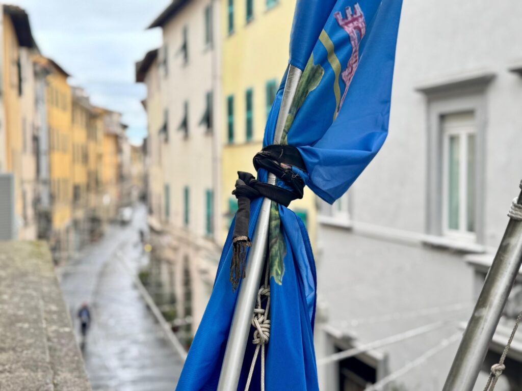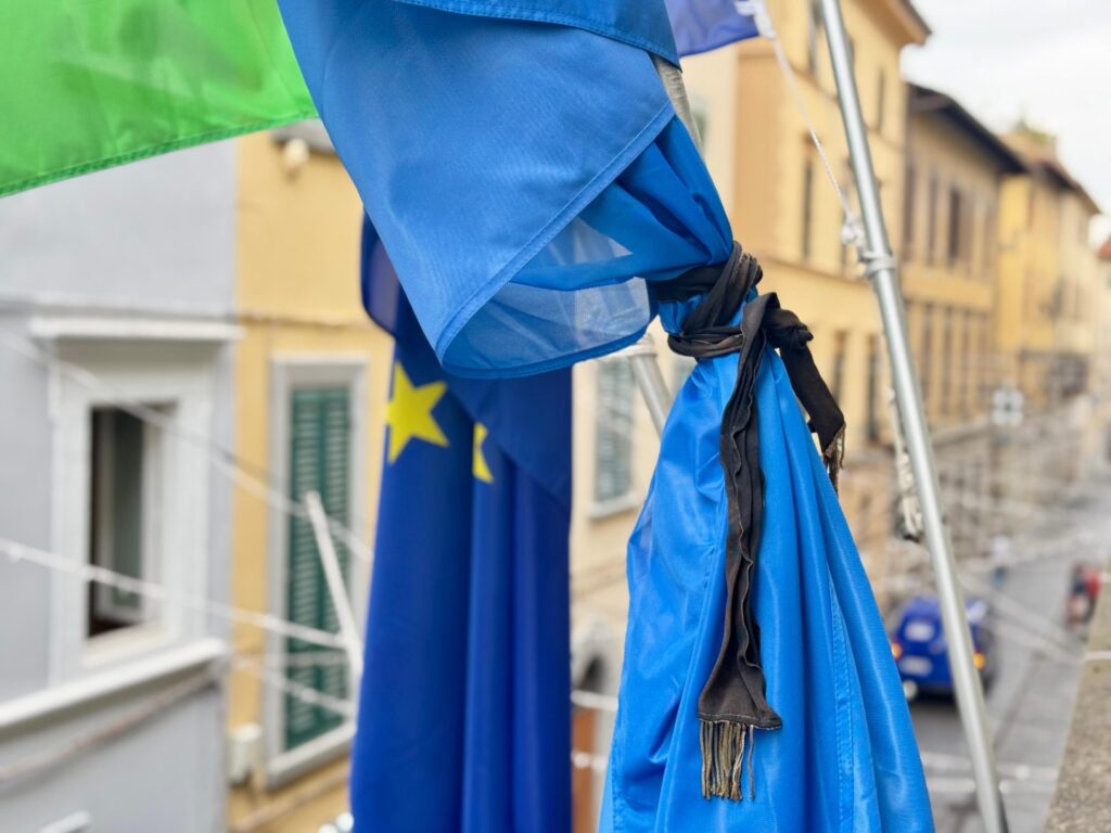 Per i diritti della Palestina, bandiera del Comune listata a lutto