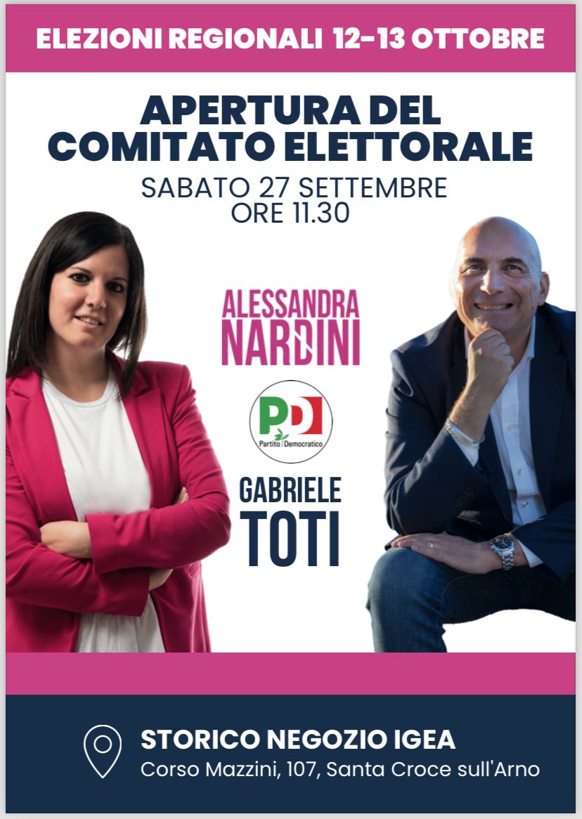 È ufficialmente costituito il Comitato Elettorale di Santa Croce sull’Arno, che sostiene le candidature di Alessandra Nardini, Assessora regionale all’istruzione, formazione professionale, università e ricerca, impiego, relazioni internazionali e politiche di genere, e di Gabriele Toti, Sindaco di Castelfranco di Sotto dal 2014 al 2024 e rappresentante del Valdarno inferiore. La sede del Comitato sarà l’ex negozio Igea in Corso Mazzini, nel cuore del centro storico, un luogo simbolico di partecipazione democratica e di impegno civico, già punto di riferimento per esperienze civiche e politiche del centrosinistra.