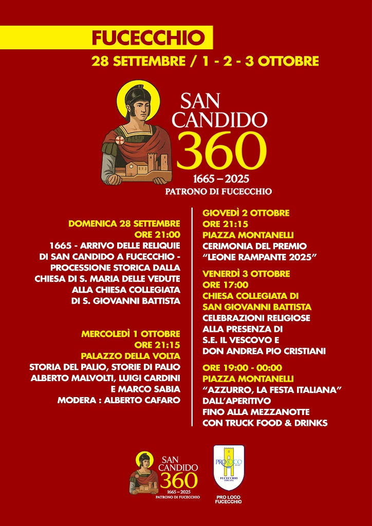 Primo appuntamento in programma, domenica 28 settembre alle ore 21, sarà la processione storica in occasione dei 360 anni dall'arrivo a Fucecchio delle reliquie di San Candido, che dalla chiesa di Santa Maria delle Vedute raggiungerà la Collegiata di San Giovanni Battista.