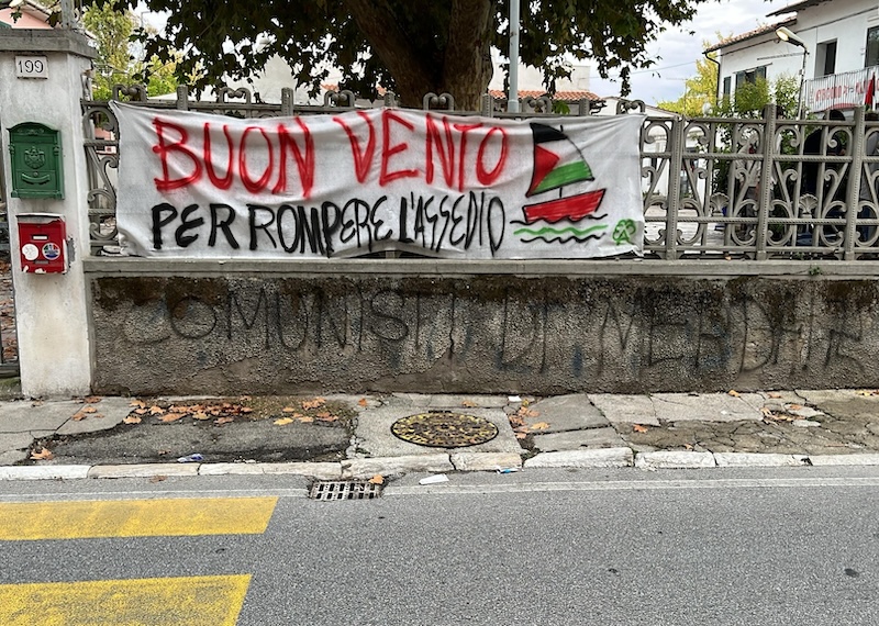 La scritta è comparsa sotto lo striscione a sostegno della Global Sumud Flotilla. I commenti in solidarietà al circolo di Pisa