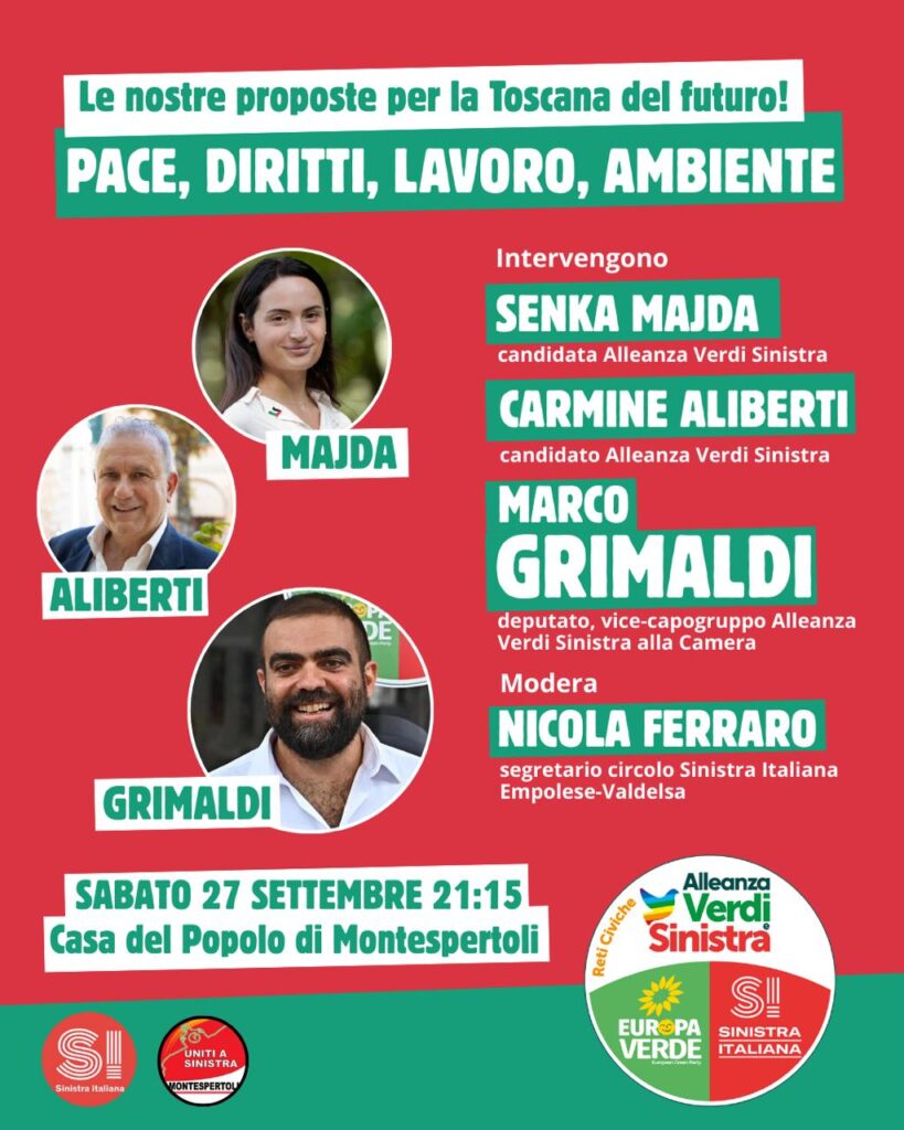 Un appuntamento politico di rilievo segna il calendario verso le prossime elezioni regionali in Toscana di Alleanza Verdi Sinistra. Sabato 27 settembre, alle 21.15 a Montespertoli, presso i locali della Casa del Popolo in piazza del Popolo, Sinistra Italiana organizza, in collaborazione con l’associazione “Uniti a Sinistra Montespertoli, un incontro pubblico dedicato ai grandi temi del futuro della regione: pace, diritti, lavoro e ambiente.