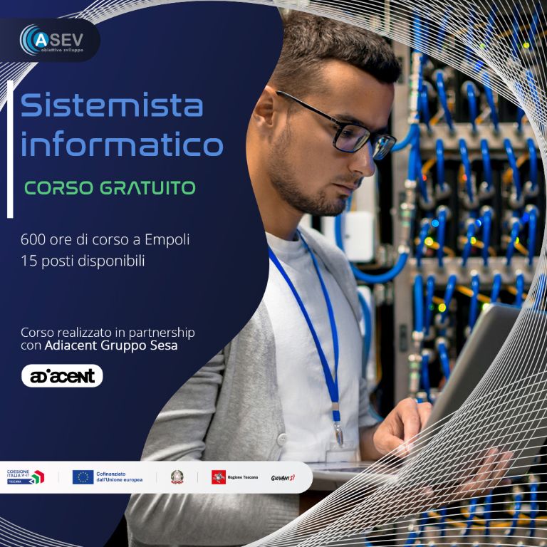 Una professione chiave per il futuro digitale e un corso gratuito che apre le porte al mondo del lavoro: a Empoli sta per partire il corso di qualifica professionale Sistemista Informatico, organizzato da ASEV in collaborazione con Adiacent Gruppo Sesa e finanziato da Regione Toscana con risorse del Fondo Sociale Europeo.
