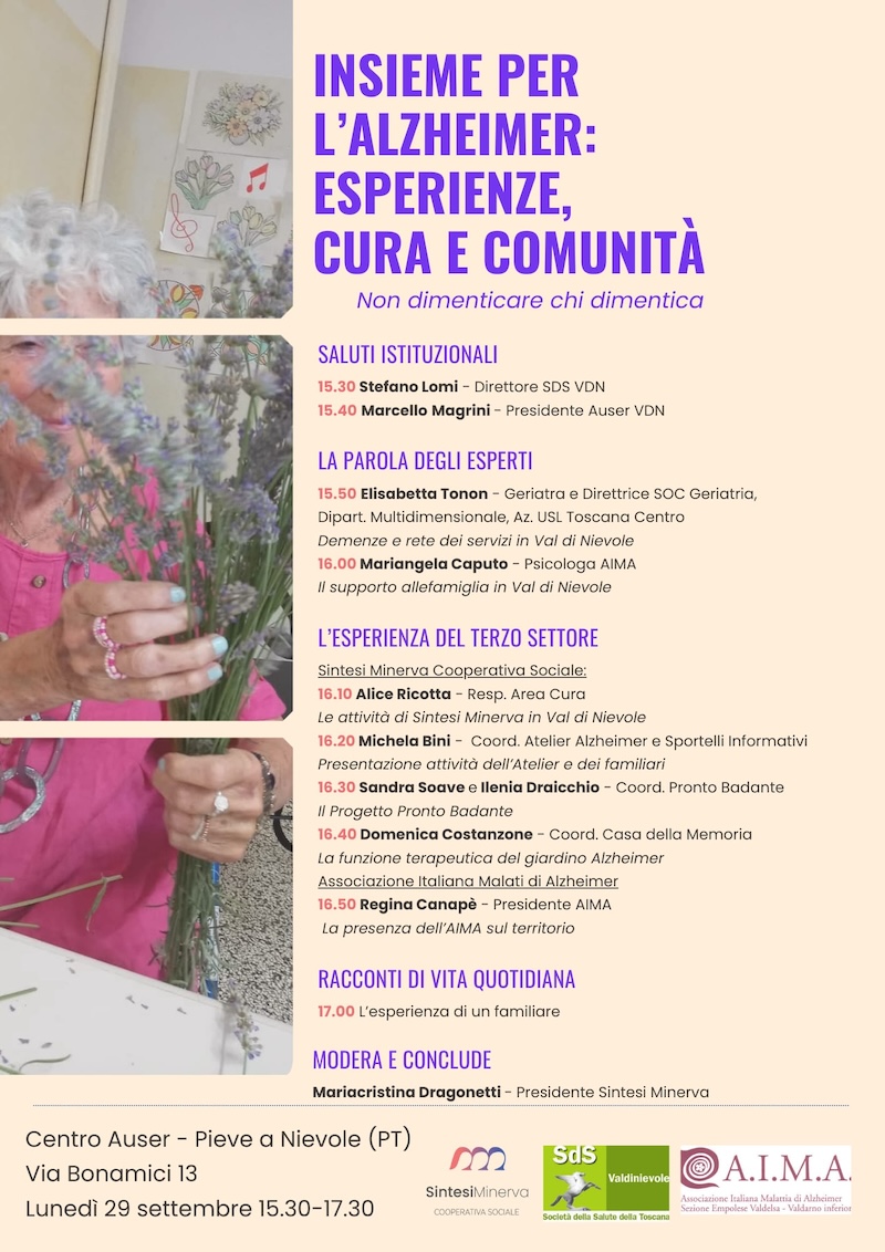 Nell’ambito del mese dedicato all'Alzheimer (settembre), la cooperativa sociale SintesiMinerva in collaborazione con la Società della Salute Valdinievole e A.I.M.A. - Associazione Italiana Malattia di Alzheimer Sezione Empolese Valdelsa-Valdarno Inferiore organizza il seminario dal titolo “Insieme per l’Alzheimer: esperienze, cura e comunità”. L’incontro si terrà lunedì 29 settembre a partire dalle ore 15.30 presso il Centro Auser, in via Bonamici 13 a Pieve a Nievole (PT).