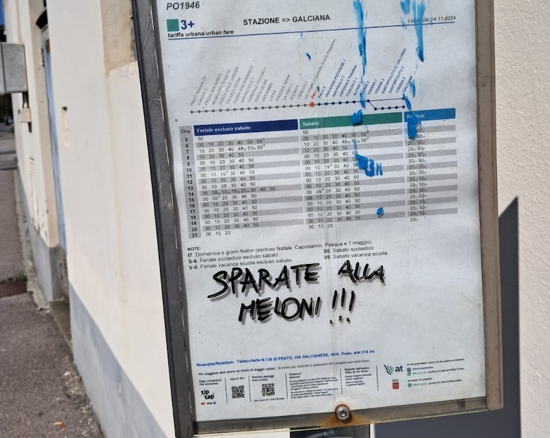 "Sparate alla Meloni" è la scritta comparsa alla fermata di via dei Palli a Prato. A denunciare la minaccia, scritta a pennarello su uno dei cartelli che si trovano alle fermate, è la deputata pratese di Fratelli d'Italia Chiara La Porta.