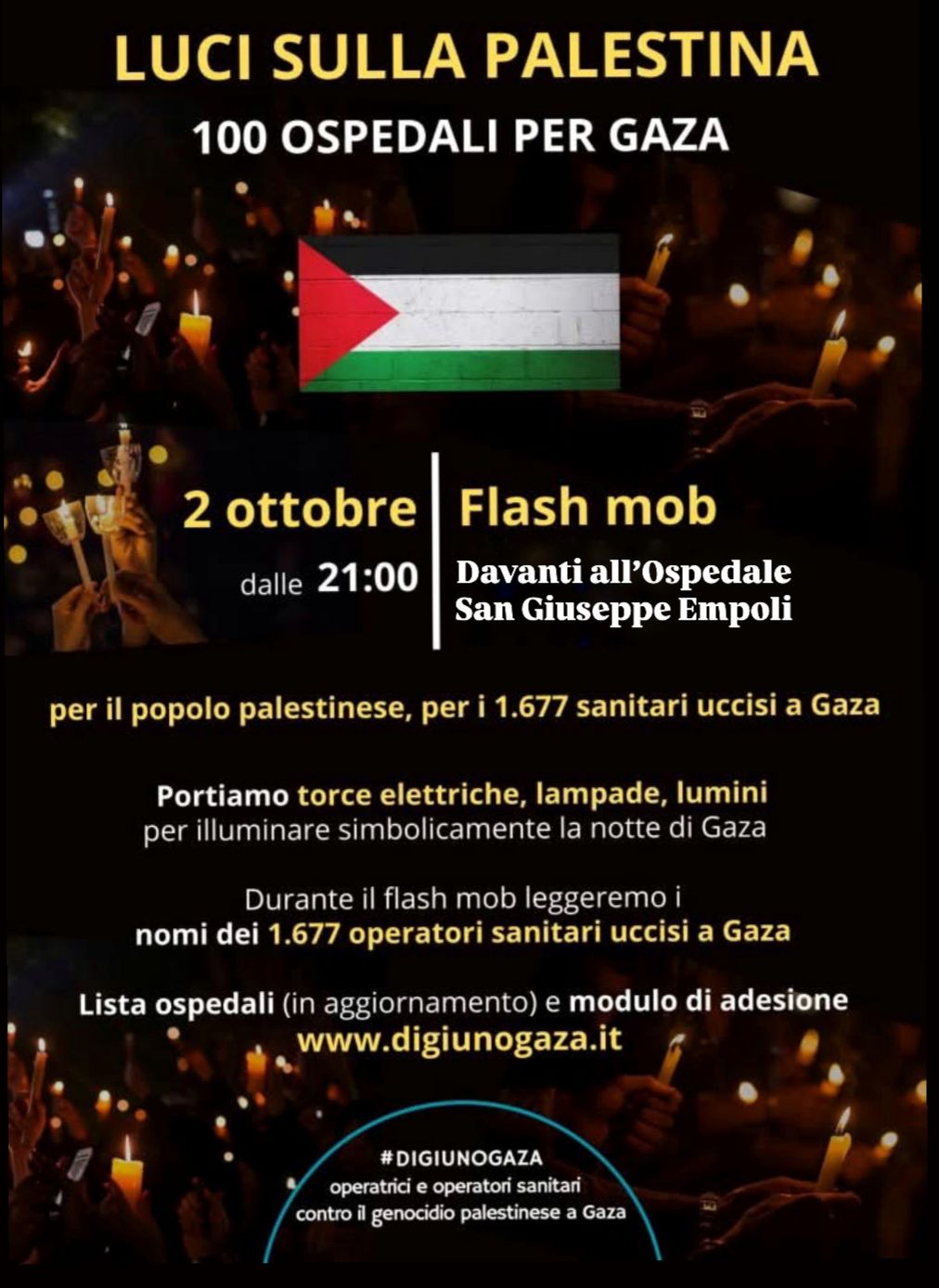 In serata, dalle 21, davanti all’ospedale San Giuseppe, si terrà invece un flash mob nell’ambito dell’iniziativa nazionale “Luci sulla Palestina – 100 ospedali per Gaza”. I partecipanti sono invitati a portare torce elettriche, lampade e lumini per illuminare simbolicamente la notte di Gaza. Durante il presidio verranno letti i nomi dei 1.677 operatori sanitari palestinesi uccisi nei bombardamenti. L’azione intende ricordare l’impatto devastante del conflitto sul personale medico e sanitario e rilanciare l’appello a fermare le violenze.